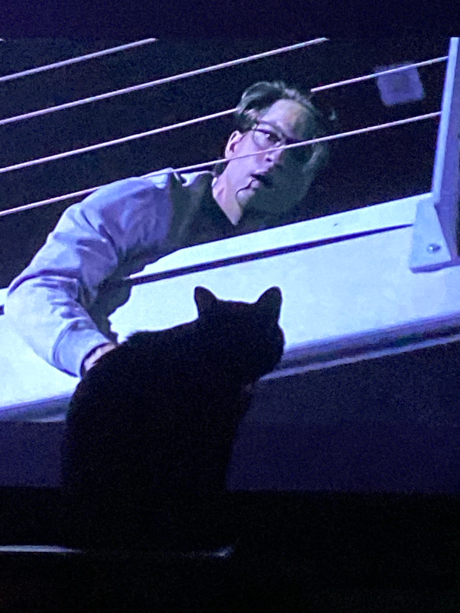 A photograph taken indoors shows a person with glasses and light skin looking off to the left. They are standing behind a structure made of vertical metal bars. To the right of the person, a dark, sil…read more