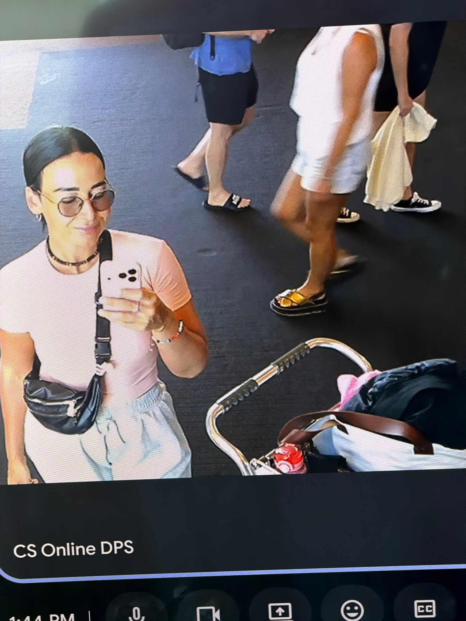 The image shows an overhead view of a group of people and objects on what appears to be a flat, gray surface, possibly a street or sidewalk. One individual, wearing sunglasses, a light pink shirt, and…read more