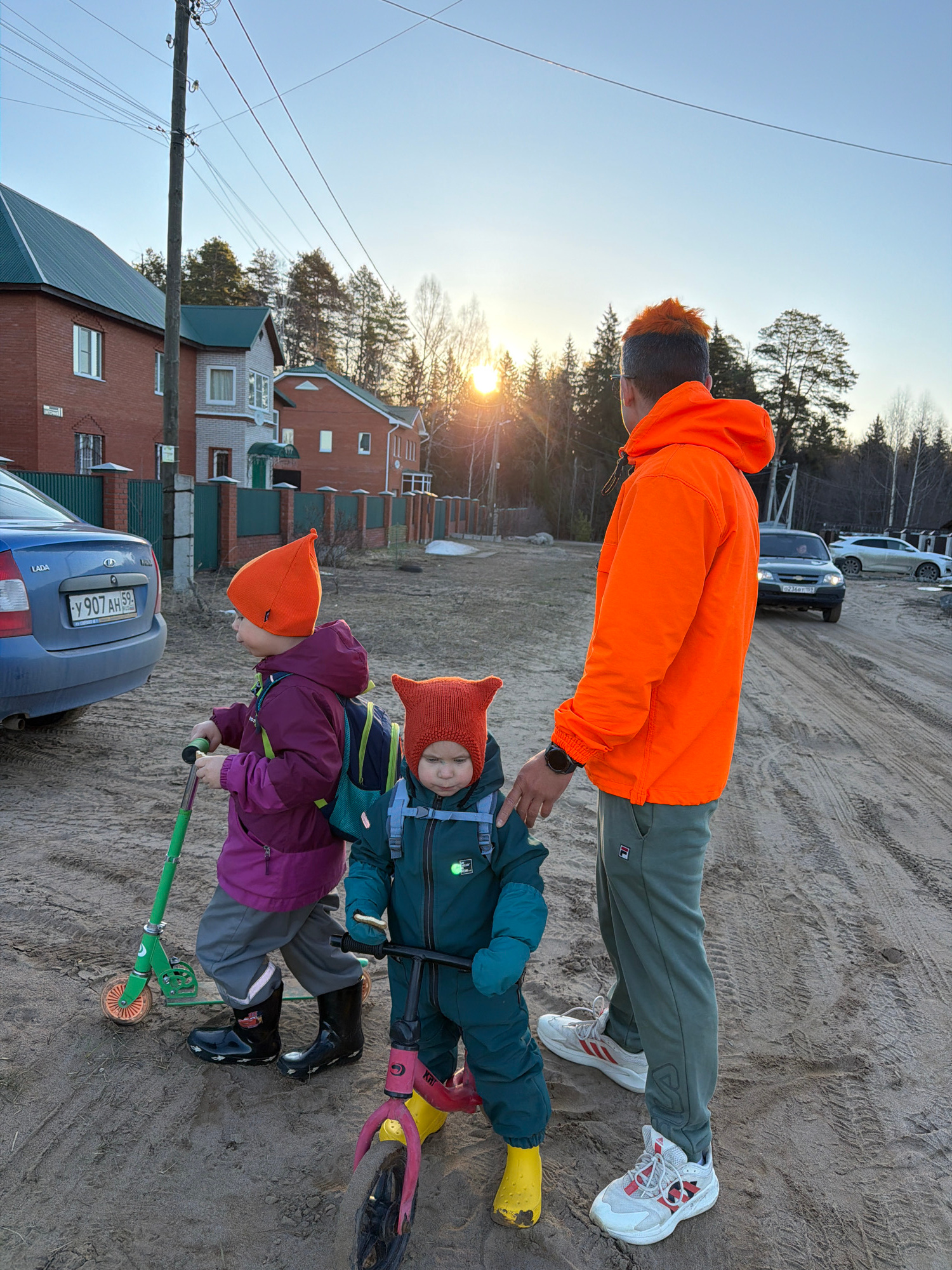 Outside in a sandy area of Chaikovsky, Russia, a man in an orange jacket and green pants stands near two children on scooters. The children wear orange hats and winter clothes. One child is riding a gā¦read more