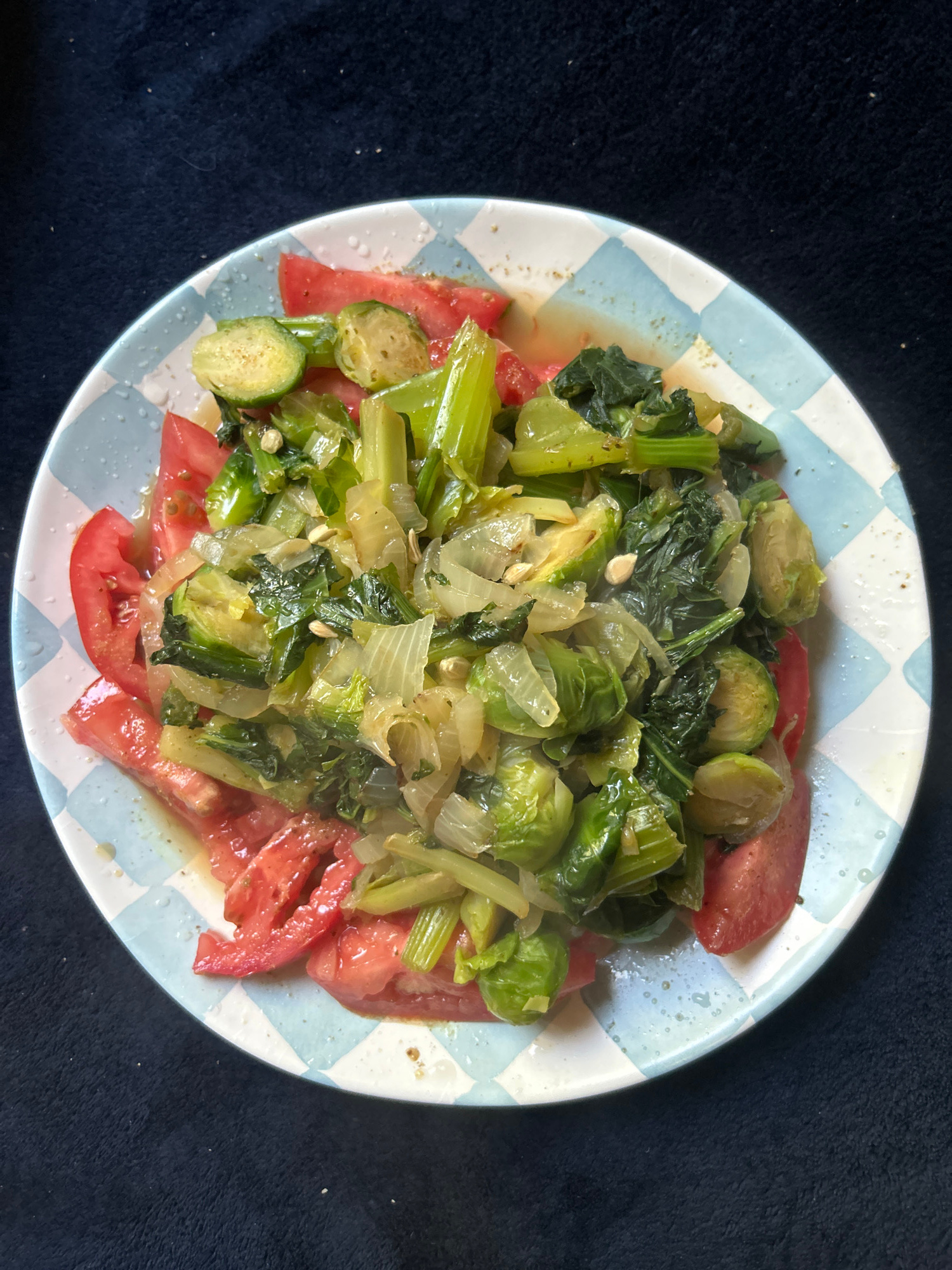 A top-down shot depicts a plate of food resting on a dark, possibly navy blue, textured surface. The plate is round with a light blue and white checkerboard pattern around the rim. The food itself ap…read more
