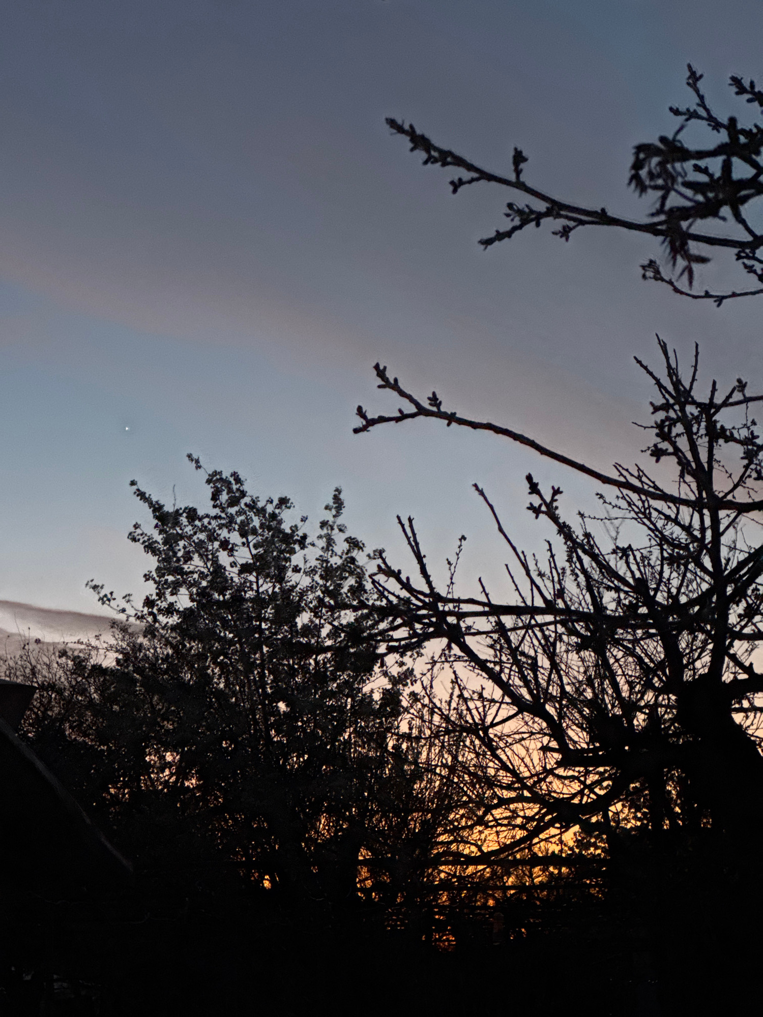 The image shows a view looking up at silhouetted trees against a twilight sky. The trees are mostly bare branches, with some smaller, leafed trees visible closer to the bottom right. The sky is a grad…read more