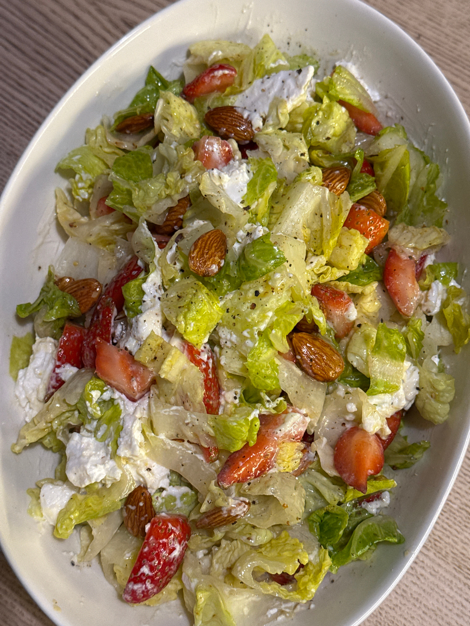 A close-up shot shows a white bowl filled with a salad composed of lettuce, sliced strawberries, almonds, and soft white cheese. The salad is dressed with a light dressing and sprinkled with black pep…read more