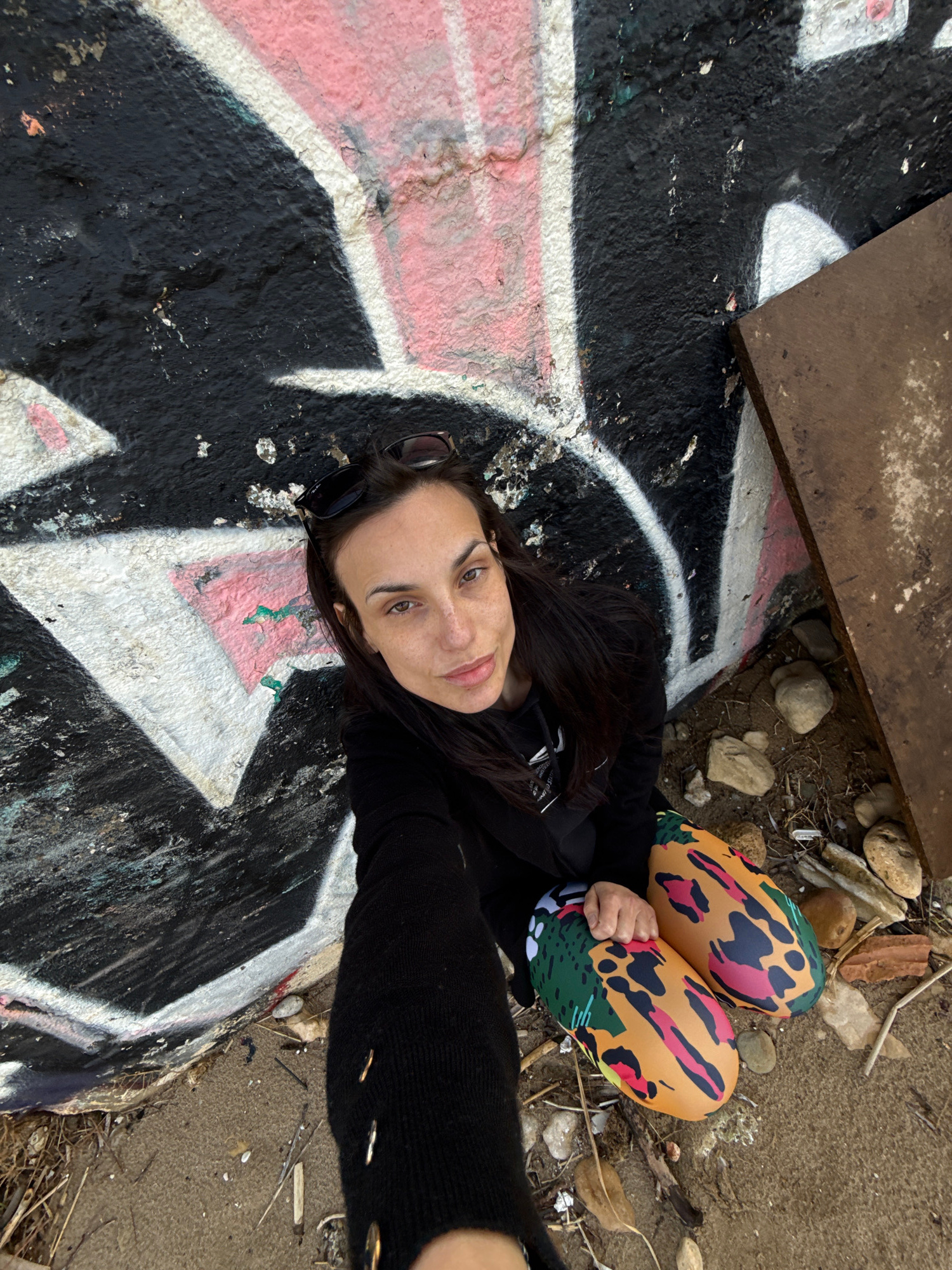 The image is a selfie of a woman lying on a painted concrete structure. The painting is a combination of black, white, and pink geometric shapes. A pair of sunglasses rests on her head. She is wearing…read more
