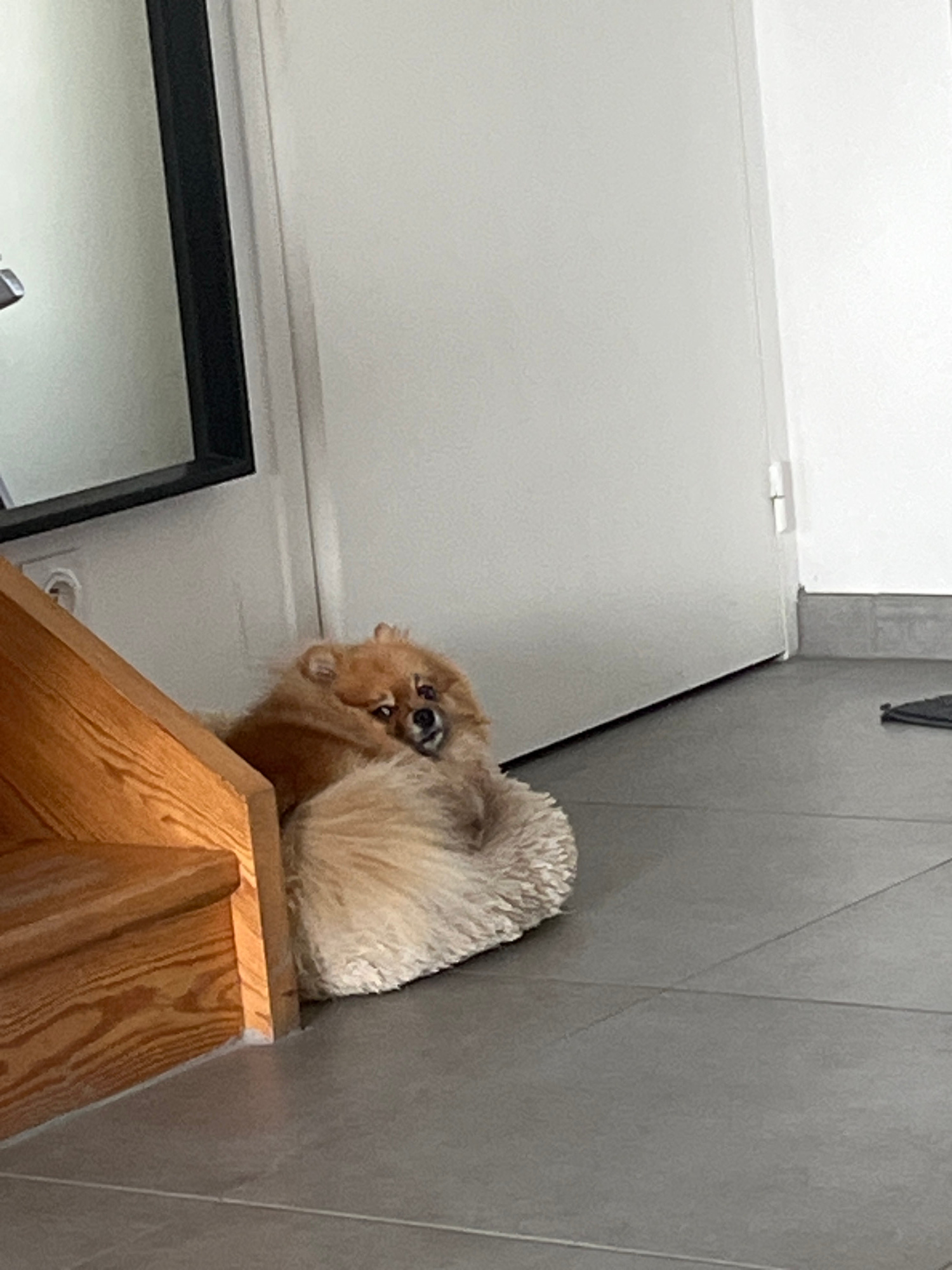 A low-angle, indoor photograph features a small, fluffy, light brown dog perched on a wooden structure. The dog's body is mostly curled away from the viewer, but its head is turned, revealing its dark…read more