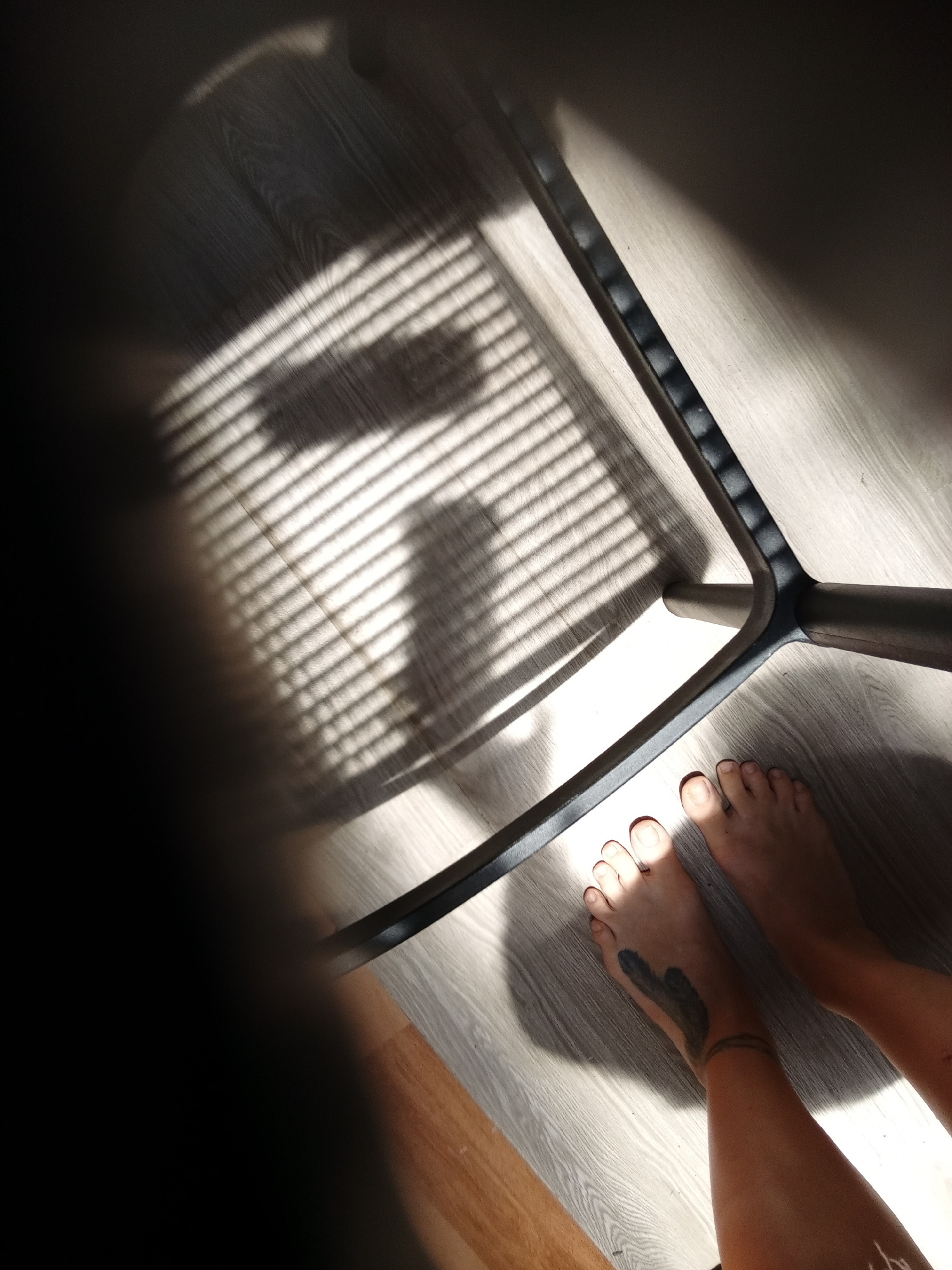 A high-angle shot depicts a section of a room where light streams through blinds, casting striped shadows on a light-colored wooden floor. The legs of a chair are visible, and a pair of bare feet are…read more