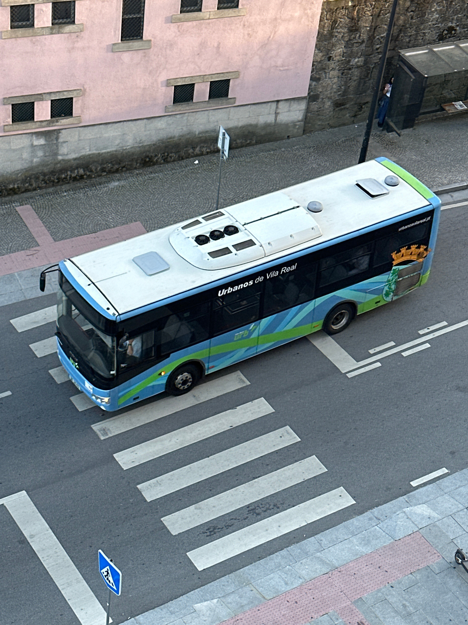A high-angle photograph depicts a bus crossing a pedestrian crosswalk in Vila Real, Portugal. The bus, primarily white with blue and green accents, features the inscription "Urbanos de Vila Real" on i…read more