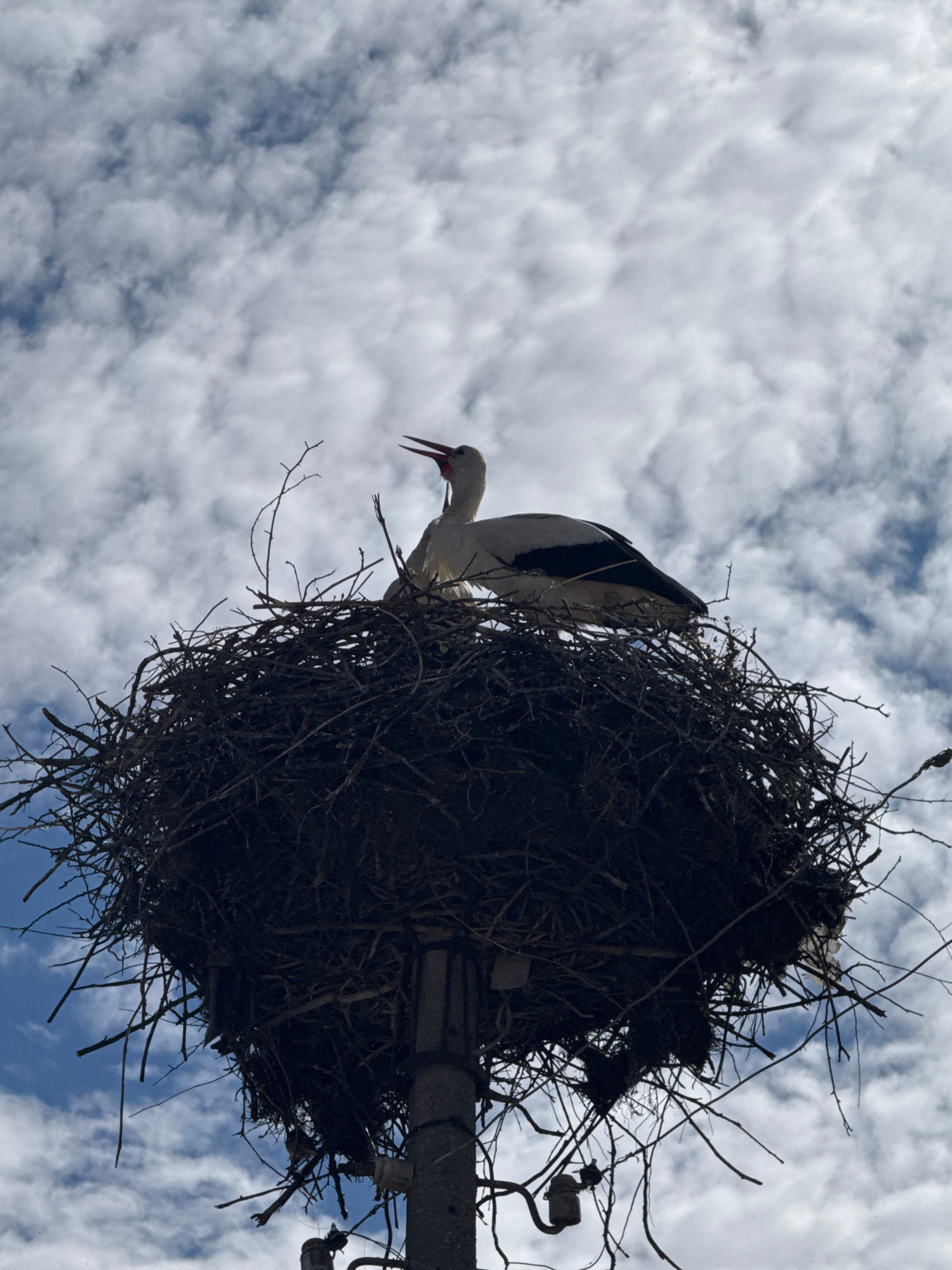 A low-angle shot shows a white stork with black wing markings standing in its large nest, which is constructed of sticks and twigs. The nest sits atop a pole with electrical equipment. The background…read more