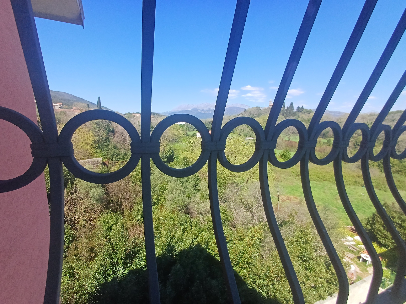 A view from what appears to be a balcony in Gošići, Montenegro, looking outwards through a decorative wrought-iron railing. The railing features a series of connected circles. Beyond the railing, lush…read more