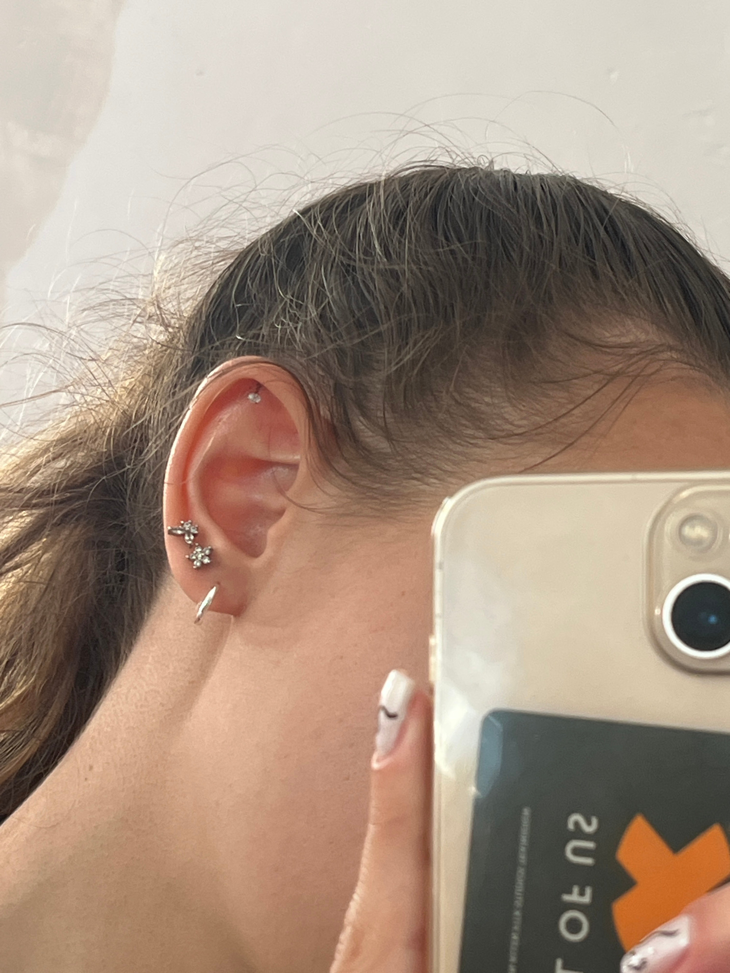 A close-up image of a person's ear with multiple piercings. There are three earrings visible: one in the helix, two in the lobe. The lobe piercings are a small, flower-shaped earring, and a small hoop…read more