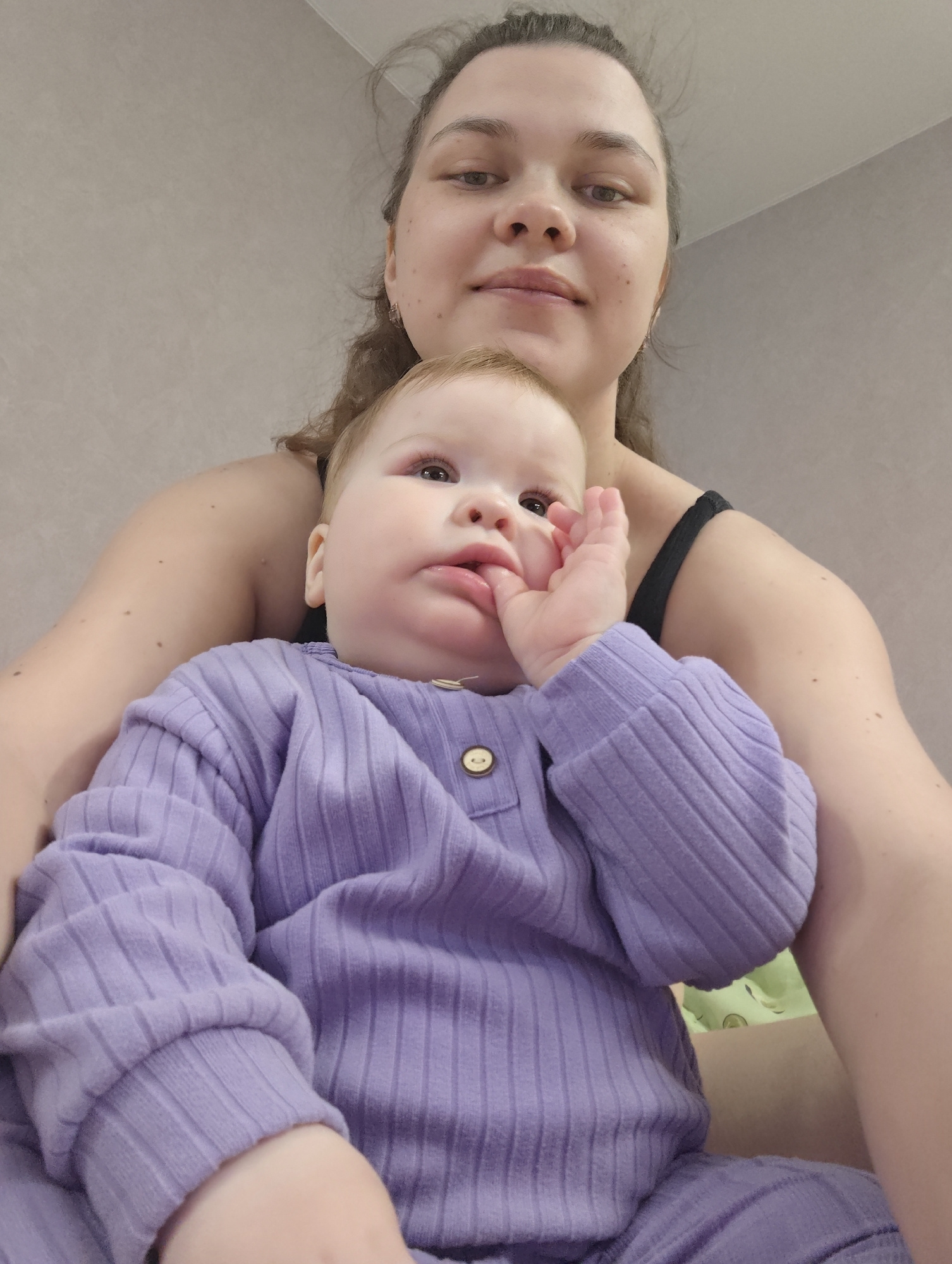A medium shot captures a mother and her baby. The mother, with her hair pulled back, faces the camera with a soft expression. She's wearing a dark-colored tank top, and her arms gently encircle the ba…read more