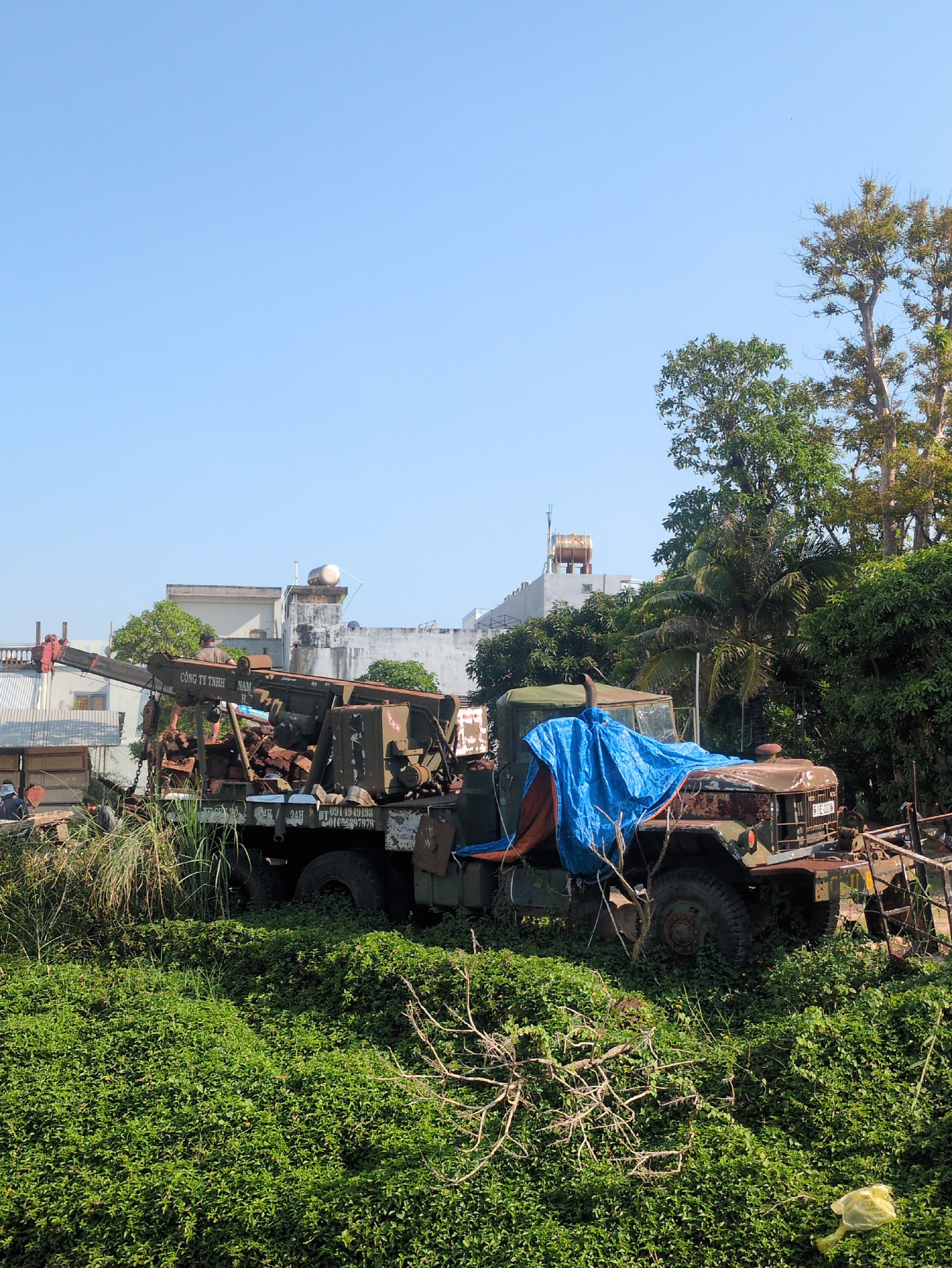 The image shows a roadside scene in Tuy Hòa, Vietnam. An overgrown, derelict military-style truck covered in a blue tarp sits amidst dense green vegetation. In the background, there is a building with a satellite dish and tower, typical of the urban landscape of Tuy Hòa. A construction crane is visible on the lower left, indicating building activity in the area. The sky is clear blue, suggesting fair weather conditions. | Open Wire