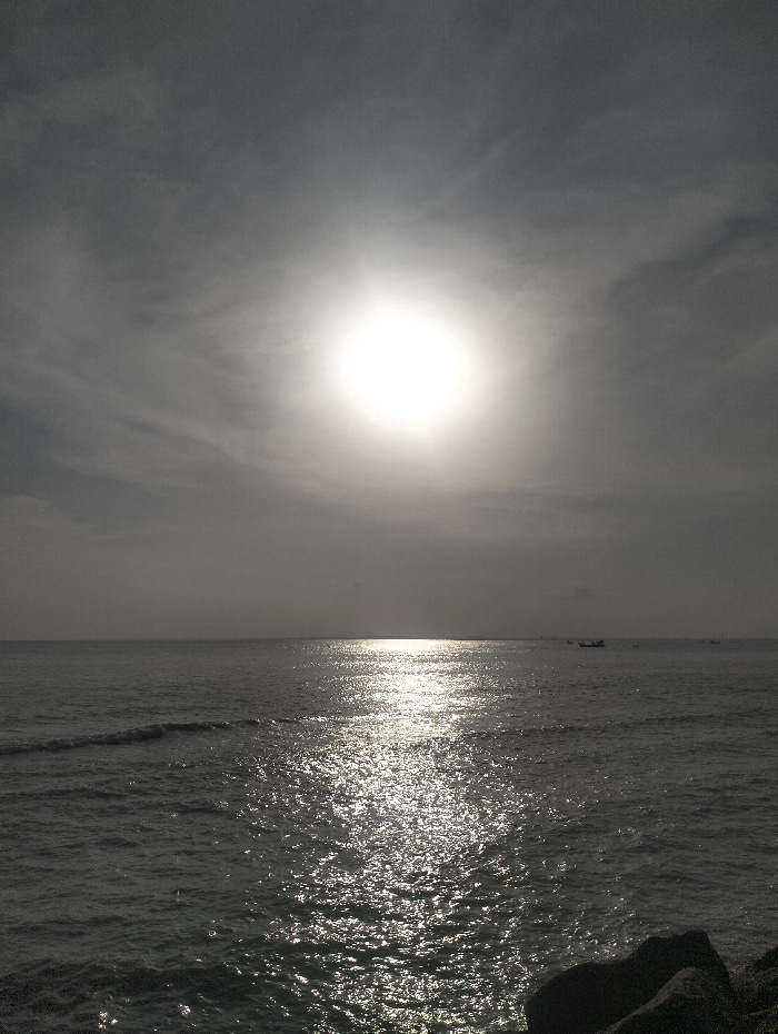A wide, glistening ocean stretches to the horizon under a hazy sky. The sun, high in the sky, blazes intensely, its light reflected in shimmering patterns across the water's surface. Small waves ripplβ¦read more