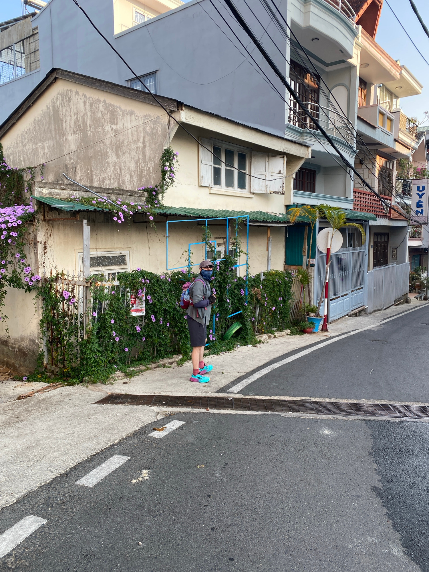 The image depicts a street scene in Da Lat, Vietnam, as suggested by the architecture and vegetation. A person stands on a sidewalk next to a building covered in purple flowers. The building appears o…read more
