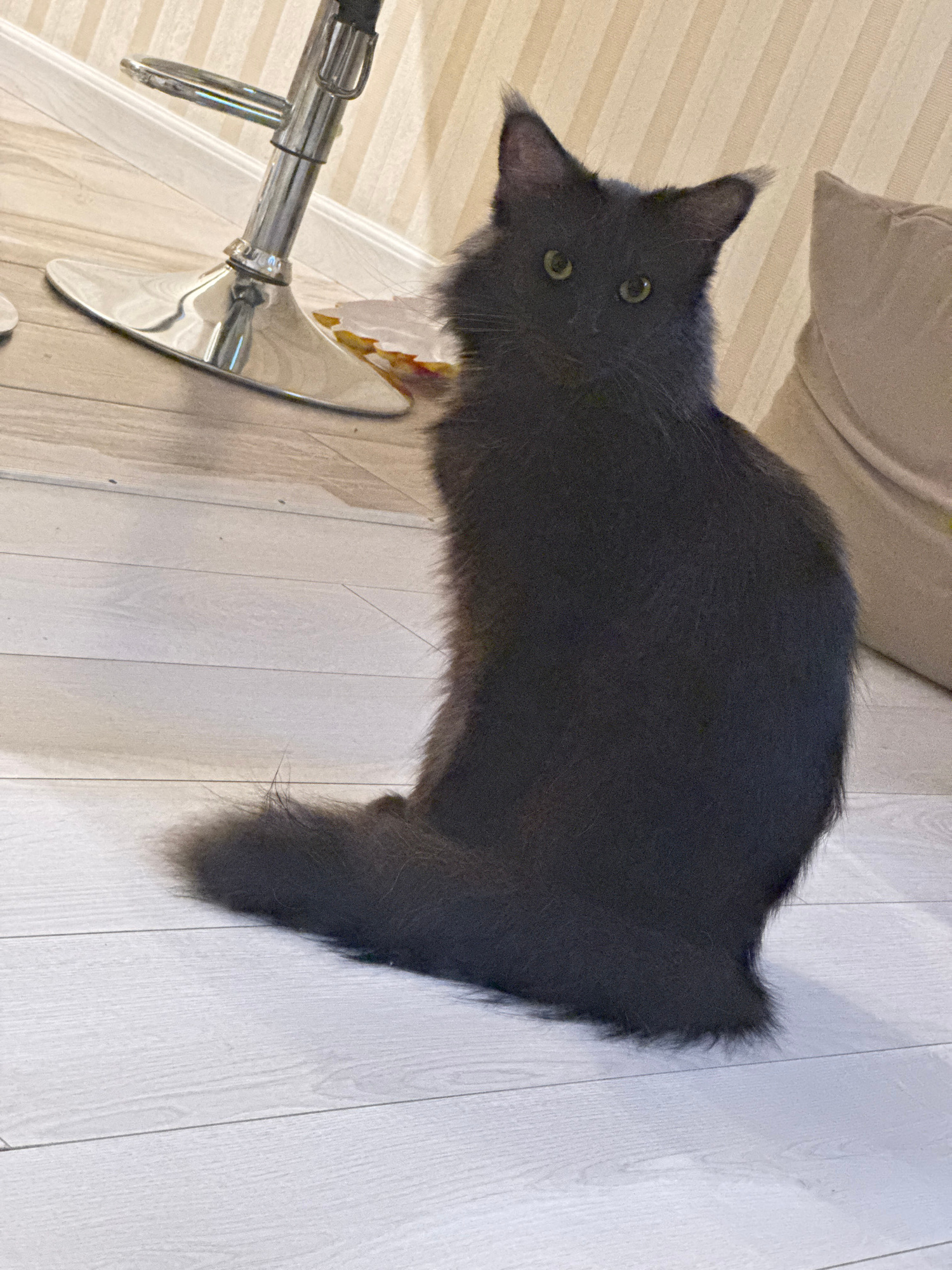 A gray cat is standing on a light-colored wooden floor. A chrome-plated chair leg and base are visible to the cat's left. A beige object (likely furniture) is partially visible in the upper left corne…read more