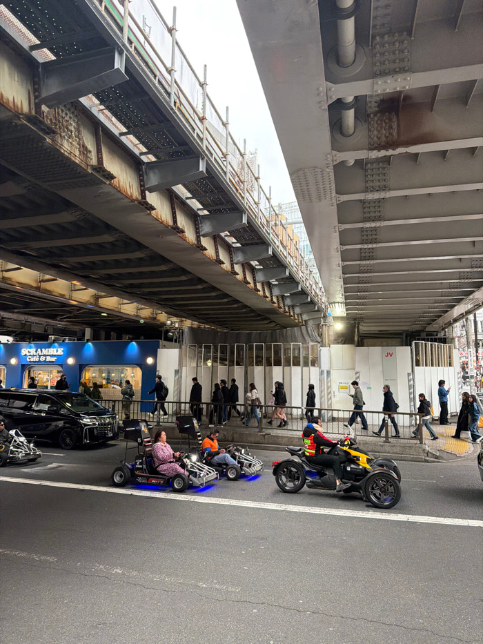 An outdoor urban scene in Shibuya, Japan, captured during daylight hours, positioned beneath multiple layers of elevated railway or highway infrastructure. The overhead structure consists of heavy ste…read more