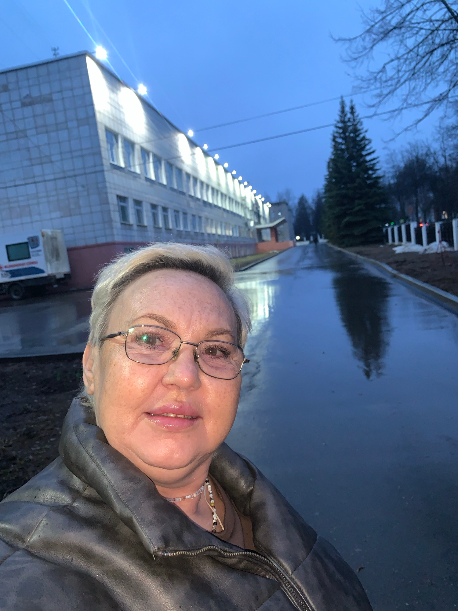 A woman with short blonde hair and glasses is taking a selfie. She is wearing a dark leather jacket and a beaded necklace is visible. The background is a wet, paved area, suggesting it has recently raβ¦read more
