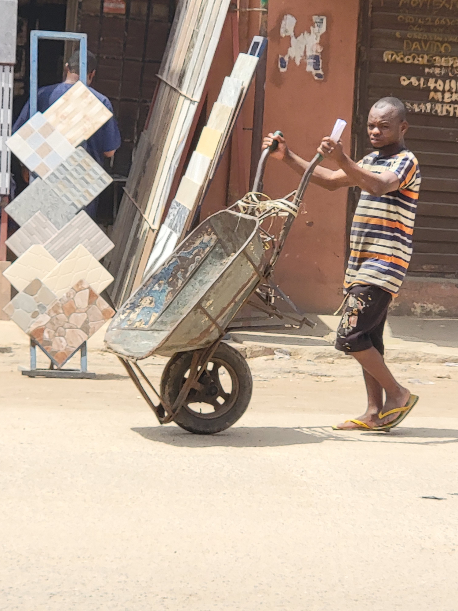 An African man wearing a striped shirt, black shorts, and yellow sandals is pushing a wheelbarrow filled with what appears to be ceramic tiles or planks. The wheelbarrow is old and rusty. The man is g…read more