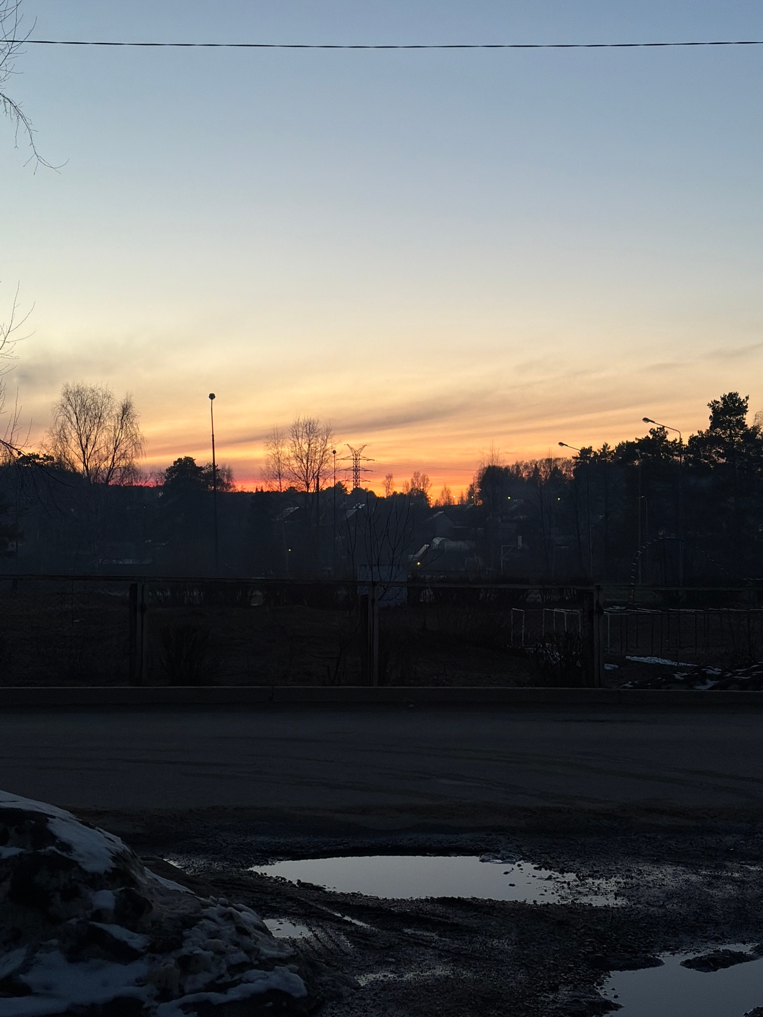 The image depicts a sunset view from what appears to be a building in Chaikovsky, Russia. The sky transitions from light blue to orange and pink hues near the horizon, with cloud formations. Silhouett…read more