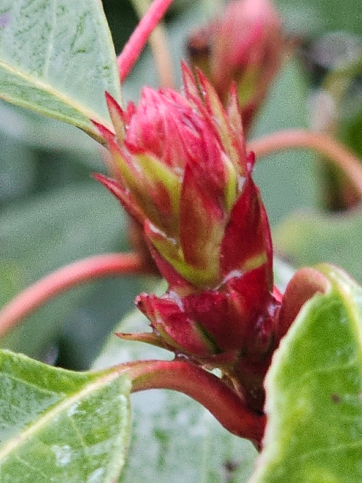 The image displays a close-up, macro-level view of a single, developing plant bud, located in Esch-sur-Alzette, Luxembourg. The bud is prominently featured in the center, exhibiting a vibrant reddish-…read more