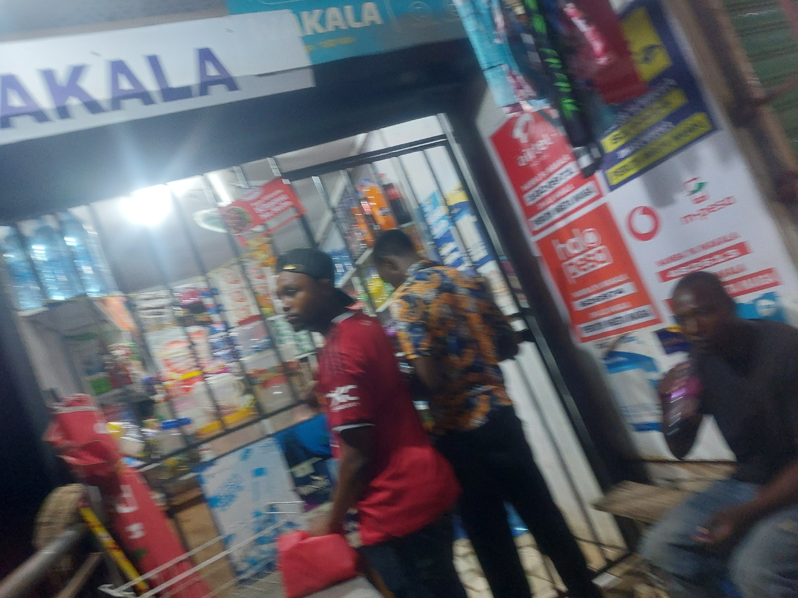 The image shows a small shop in Dar es-Salaam, Tanzania, identifiable by the Swahili word "AKALA" on the shop sign and the presence of mobile money advertisements (e.g., "Halo Pesa," "M-PESA"). The sh…read more
