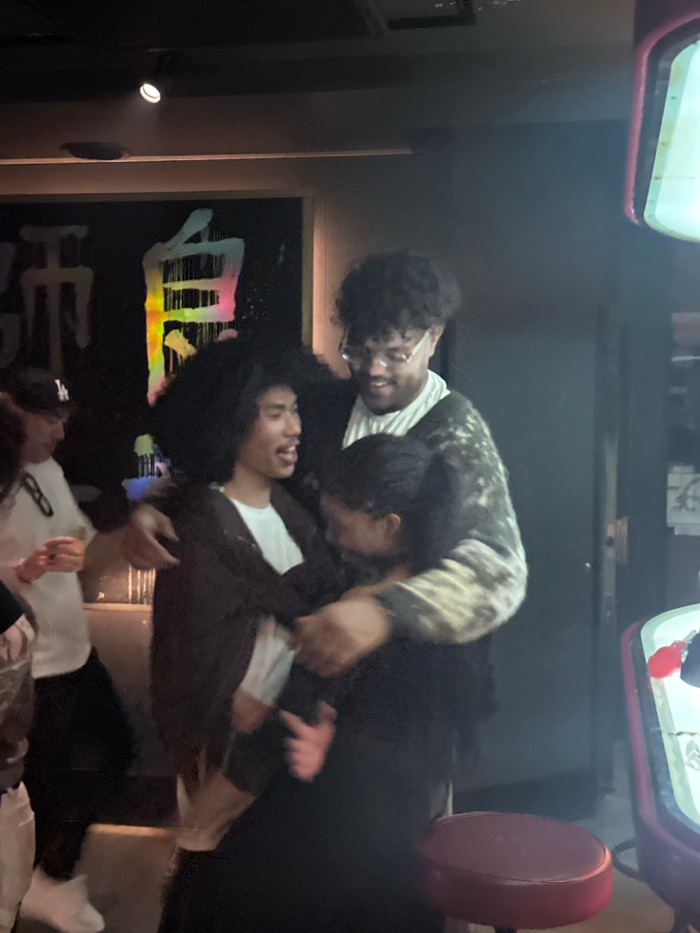 The image depicts an indoor scene in Shibuya, Japan, featuring four individuals in a social gathering. In the foreground, three people are in a close embrace. A male with dark, wavy hair, wearing a wh…read more