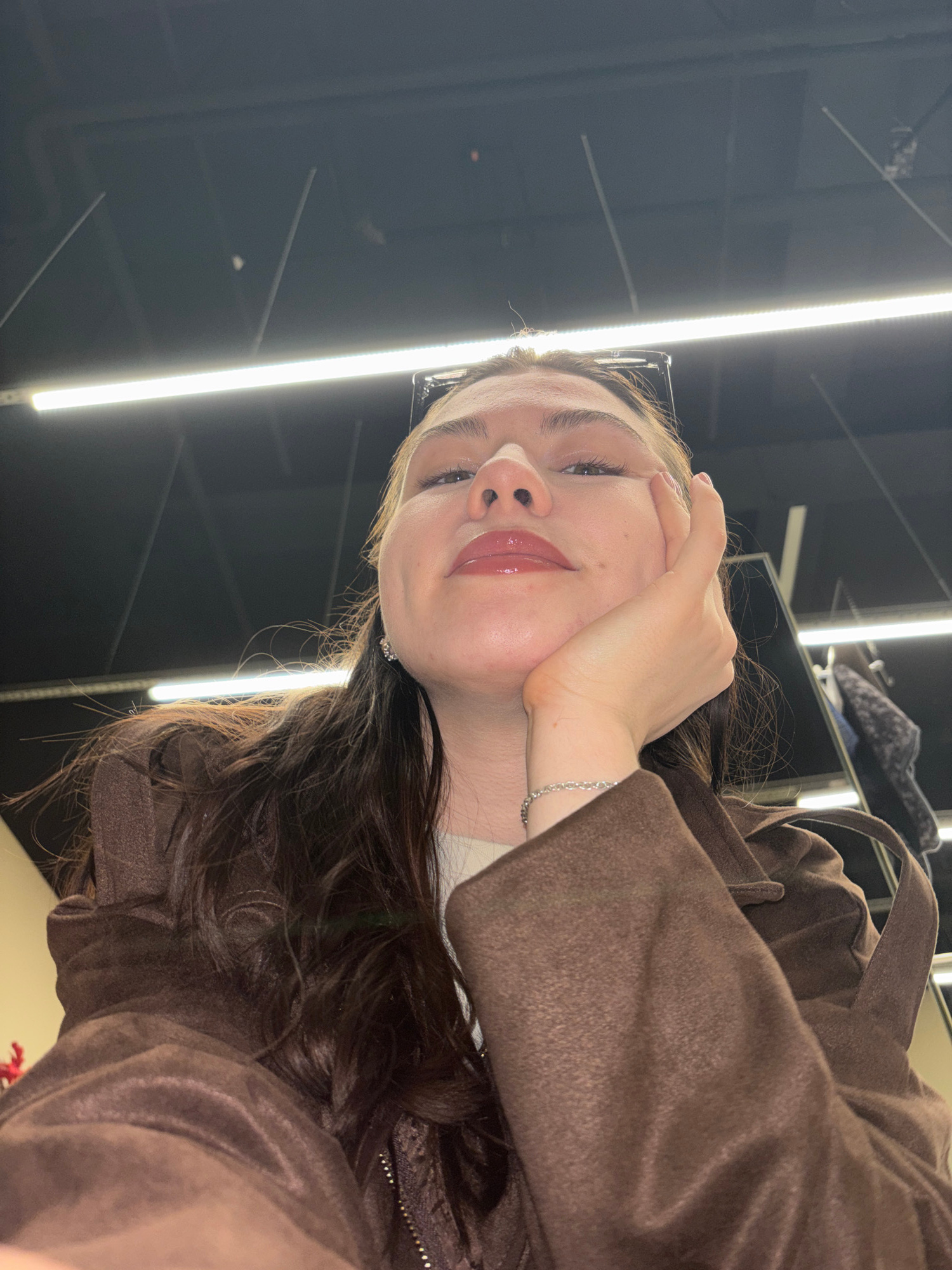 An upward-angled, close-up shot captures a young woman from the chest up in an indoor setting, likely in Perm, Russia. She has long, dark hair styled in waves and fair skin. Her light-colored eyes are…read more