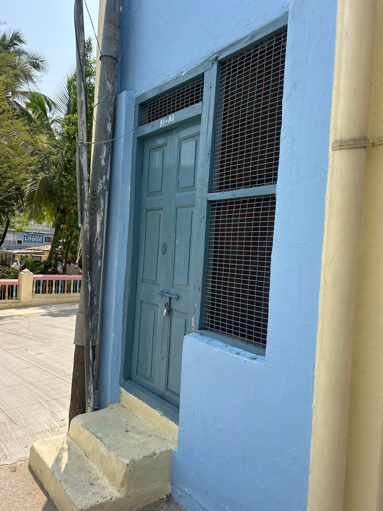 The image shows a blue building with a light yellow trim. The main feature is a blue door with a metal grille above it. The number "19-A1" is written in white on the door frame. The door appears to be…read more