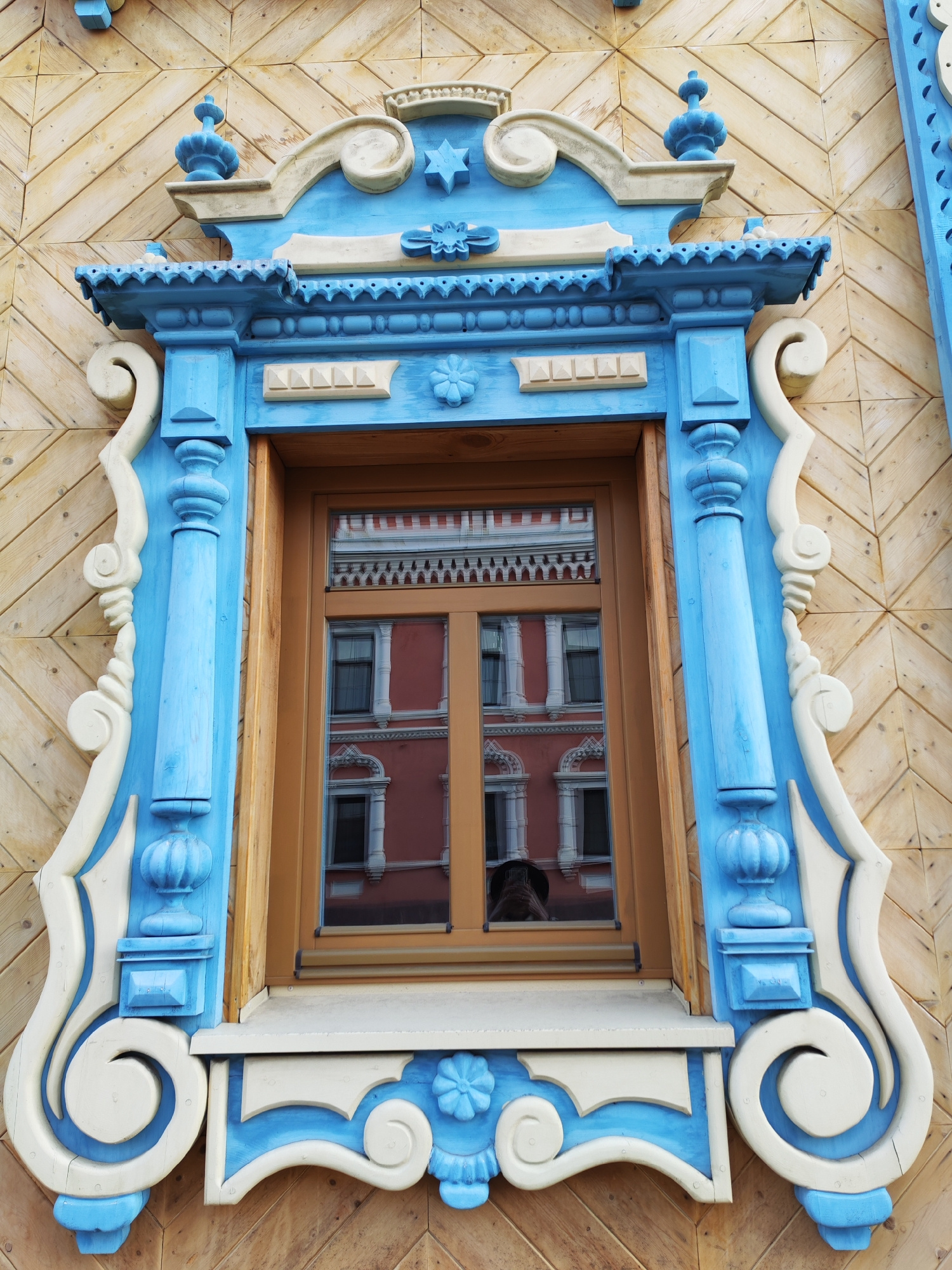 A detailed view of an ornate window in Sarapul, Russia is presented. The window frame is painted a bright blue and accented with white carvings. The frame is adorned with decorative moldings and sculp…read more