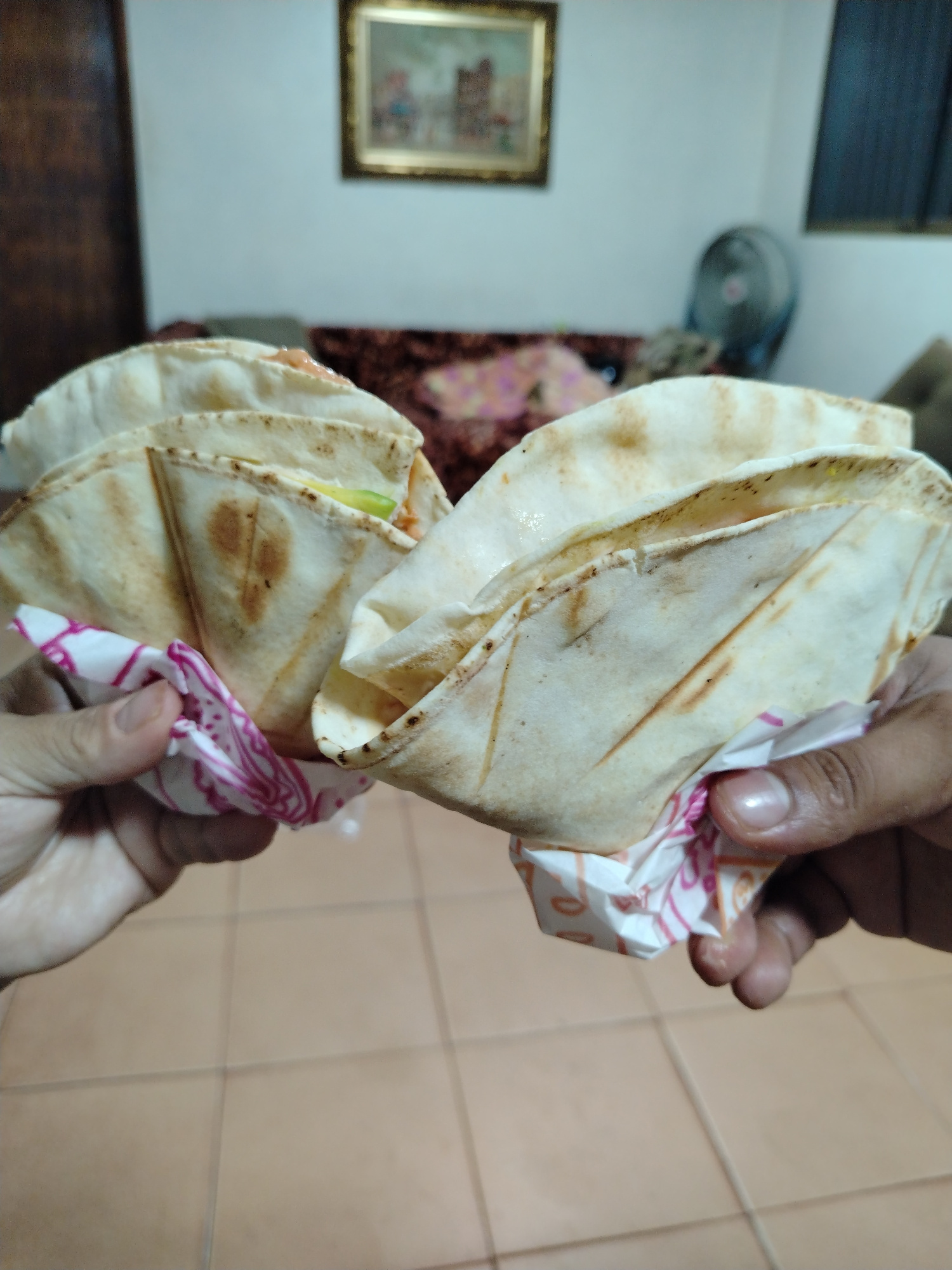 Two hands are holding filled pita bread wraps, each in a white paper wrap with pink designs. The background includes a tiled floor, a couch, a painting on the wall, and a fan. The image was taken indo…read more