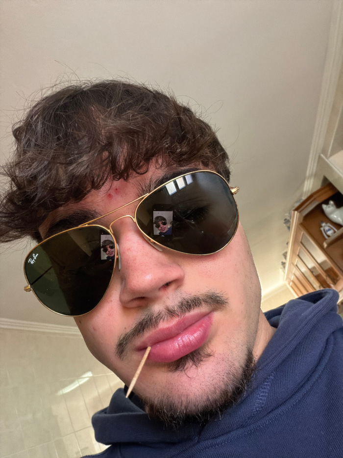A close-up, low-angle indoor image depicts a young male subject in Vila Real, Portugal. The subject presents with dark, curly hair, a mustache, and a goatee, and an erythematous lesion is visible on h…read more