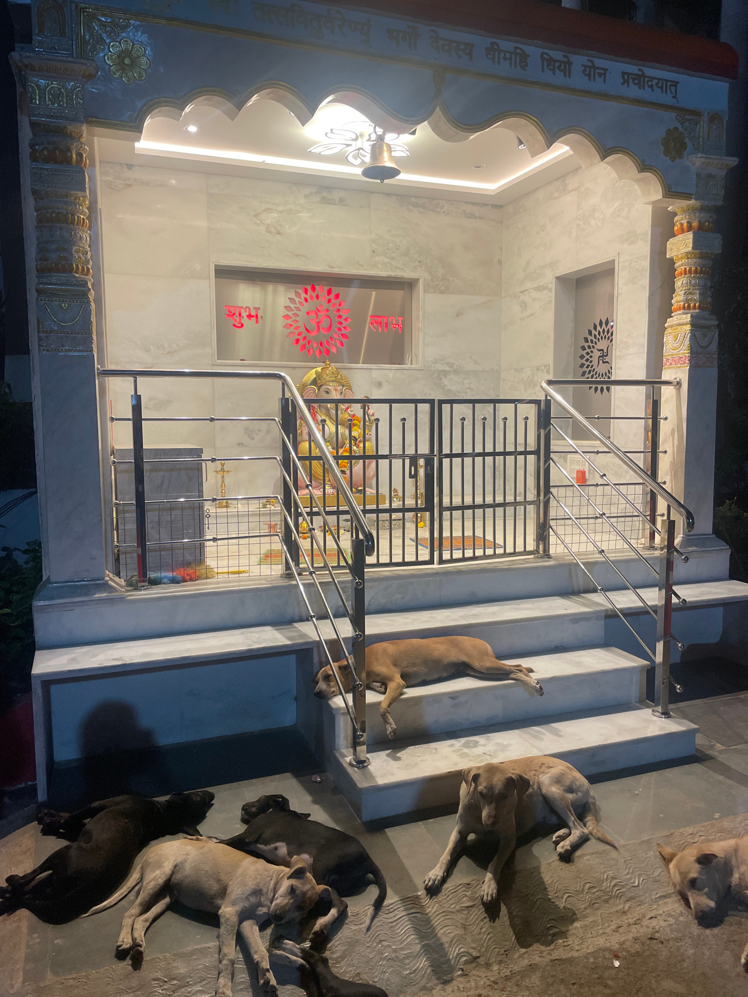 The image captures a Hindu temple facade in Mumbai, India, during the night. The temple's entrance, illuminated by bright lighting, features ornate carvings and religious symbols. A staircase with met…read more