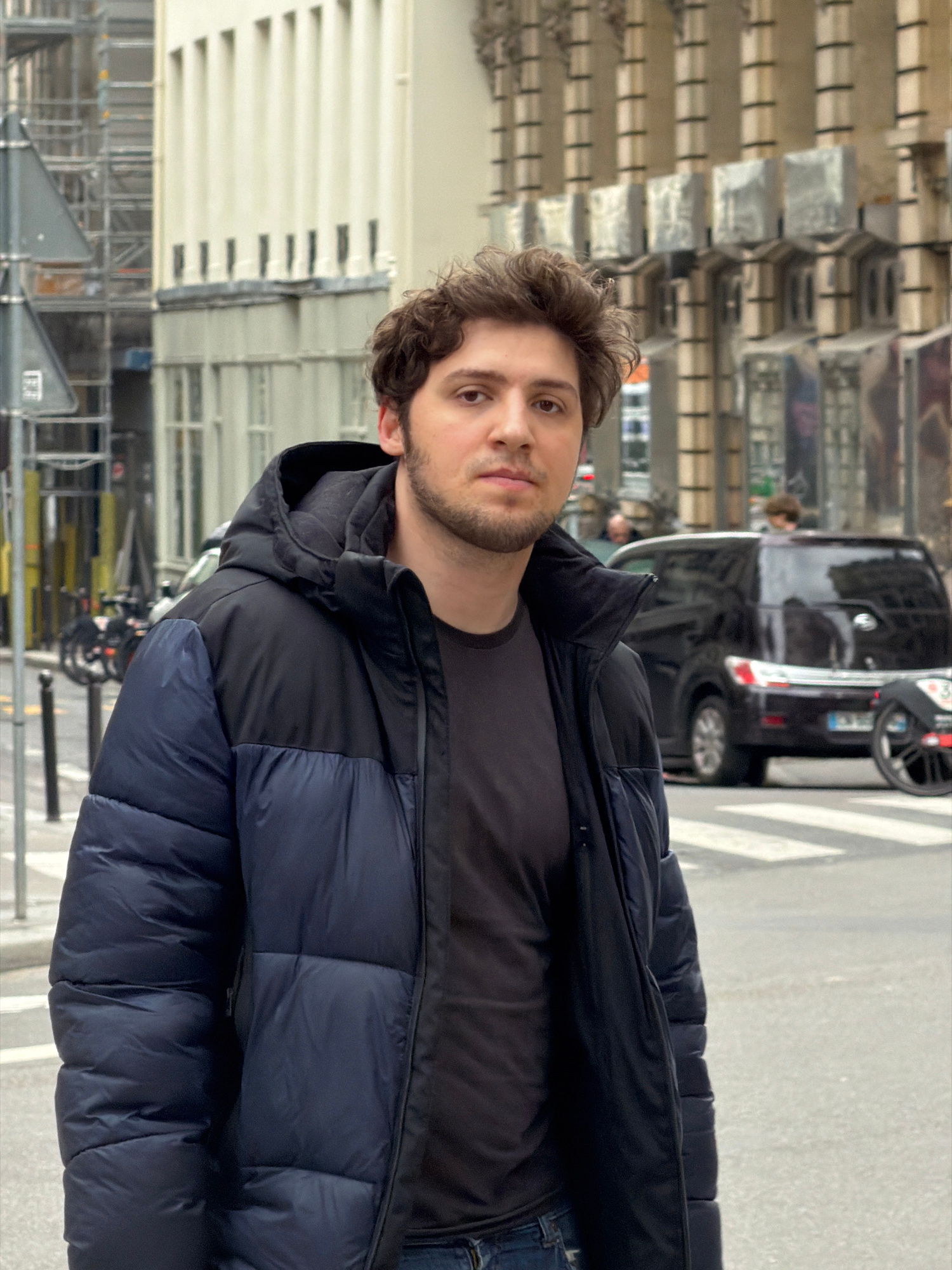 The image shows a man with brown, curly hair and a beard, wearing a dark-colored puffer jacket and a black t-shirt. He is standing in an urban environment, likely in Paris, France. The background incl…read more