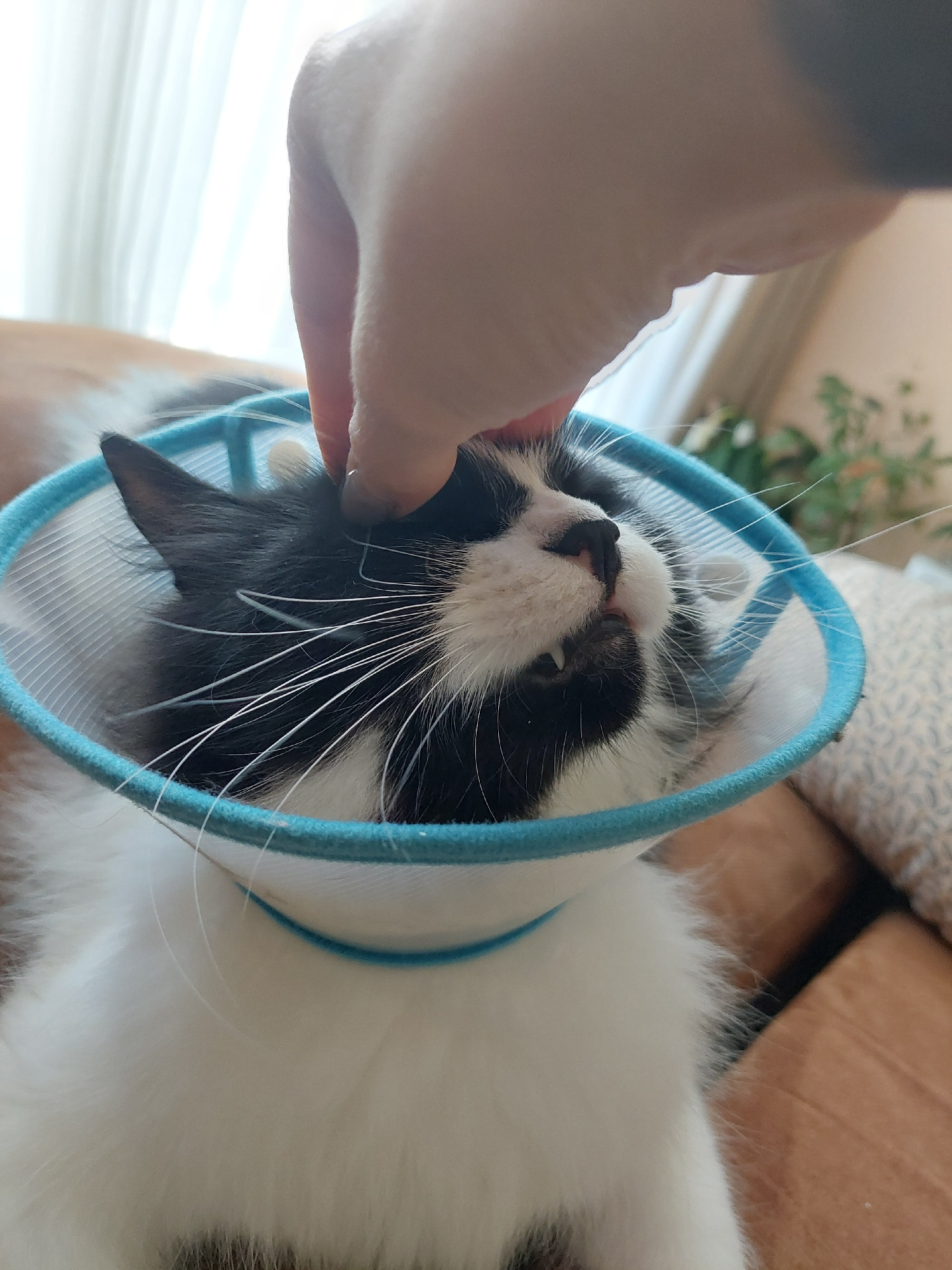 A close-up shot shows a black and white cat wearing a light blue Elizabethan collar. A human hand is petting or touching the cat's face near its ear. The cat is lying down, likely on furniture. A hous…read more