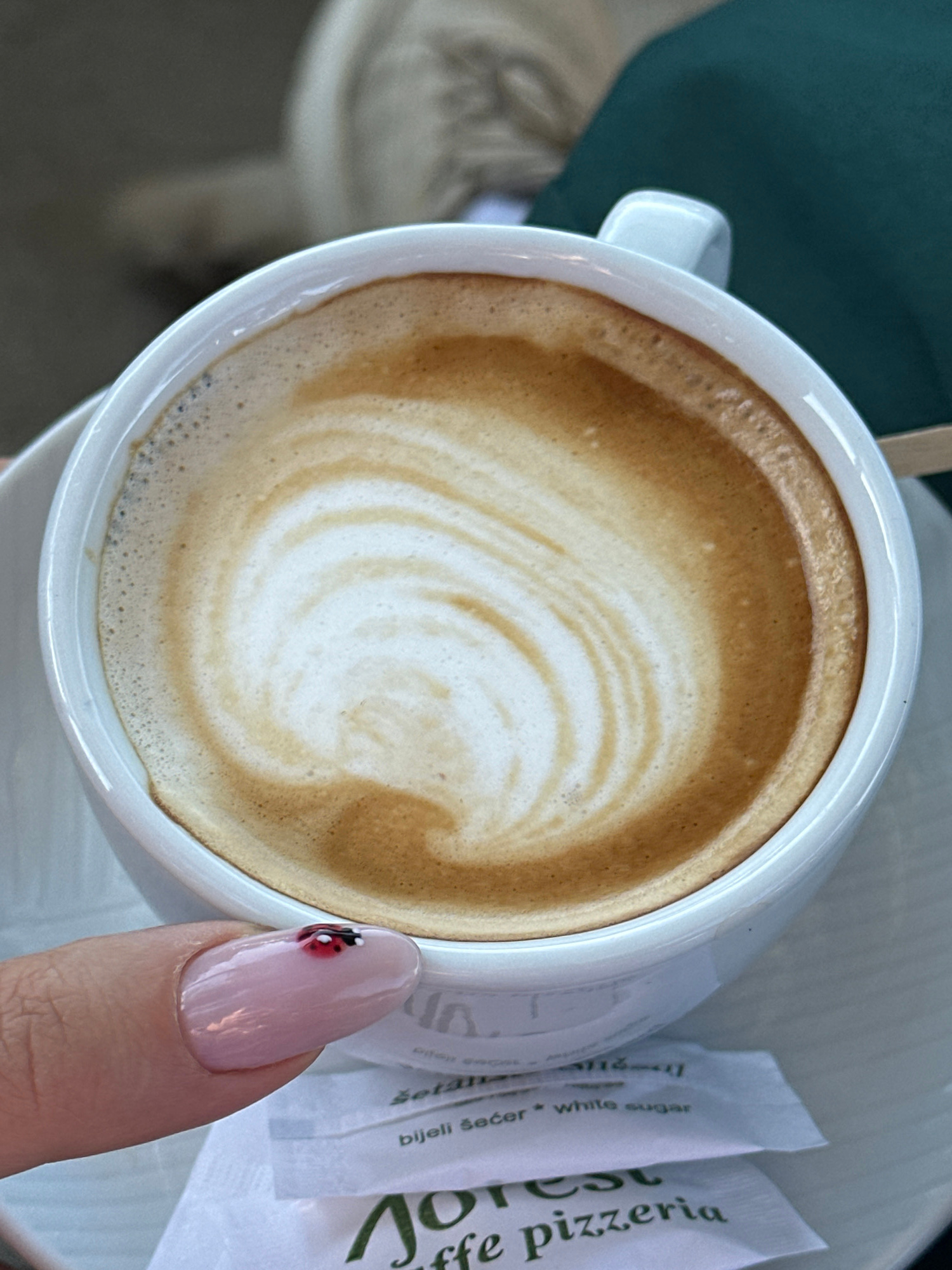 The image shows a close-up, top-down view of a cappuccino in a white ceramic mug, presumably taken at or near the Aorest caffe pizzeria in Šušanj, Montenegro, suggested by the branded sugar packets vi…read more