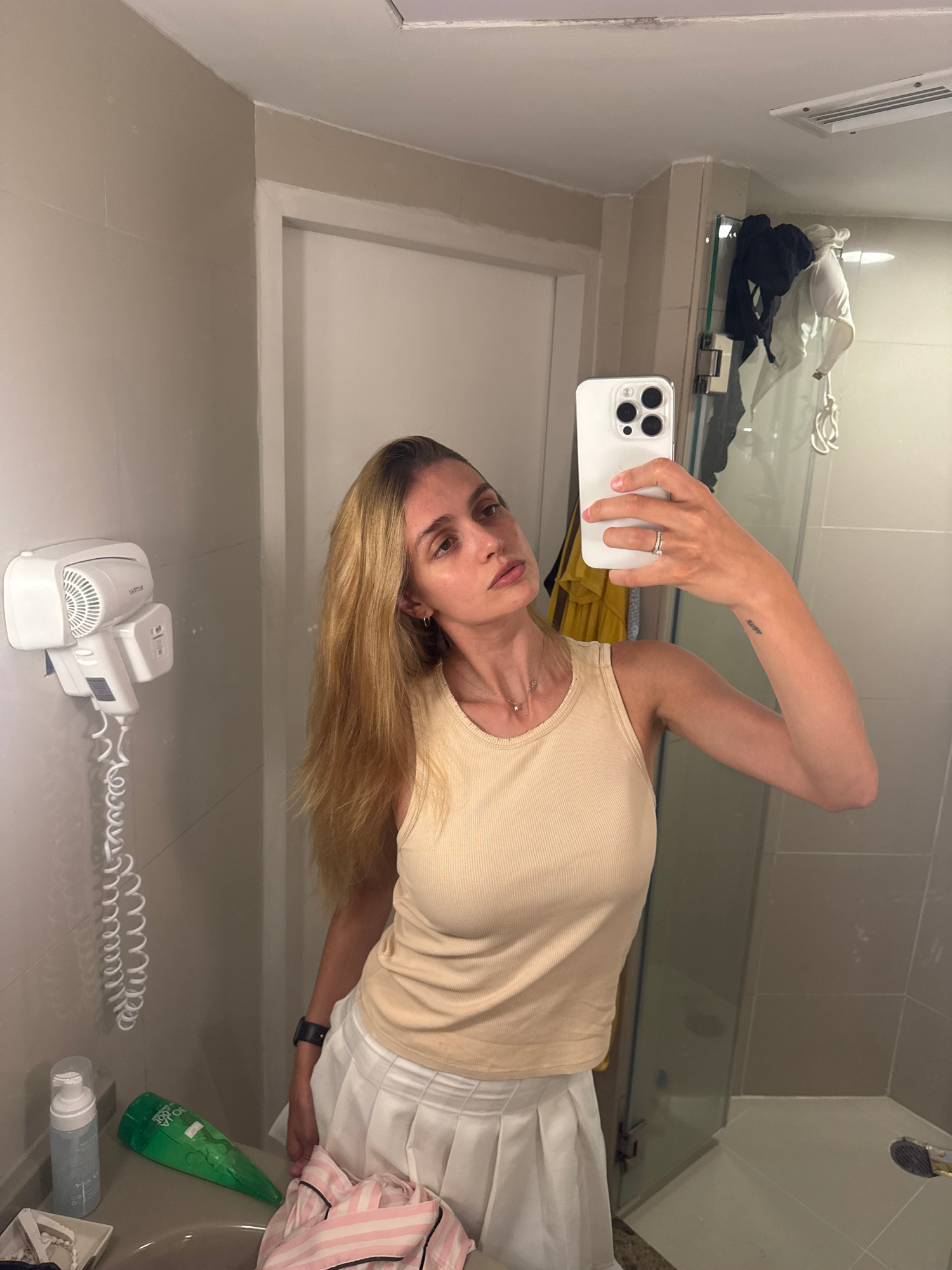 The image shows a woman taking a selfie in a bathroom. She is fair-skinned with blonde hair, wearing a beige tank top and white shorts. She holds a white iPhone in her right hand. The bathroom has whi…read more