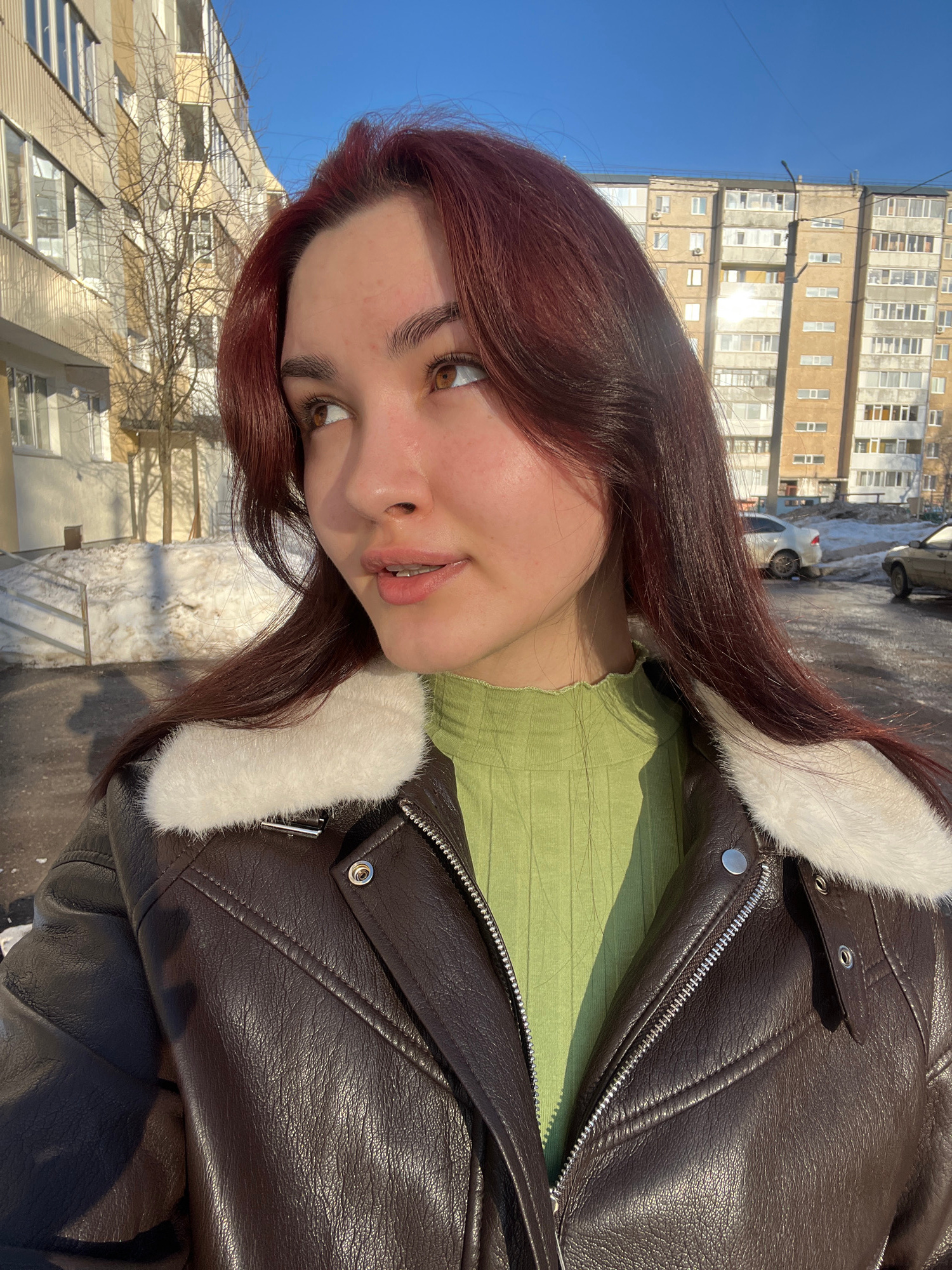A young woman with auburn hair and brown eyes is seen outdoors in front of a multi-story apartment building, likely located in Neftekamsk, Russia. She is wearing a brown leather jacket with white fur…read more