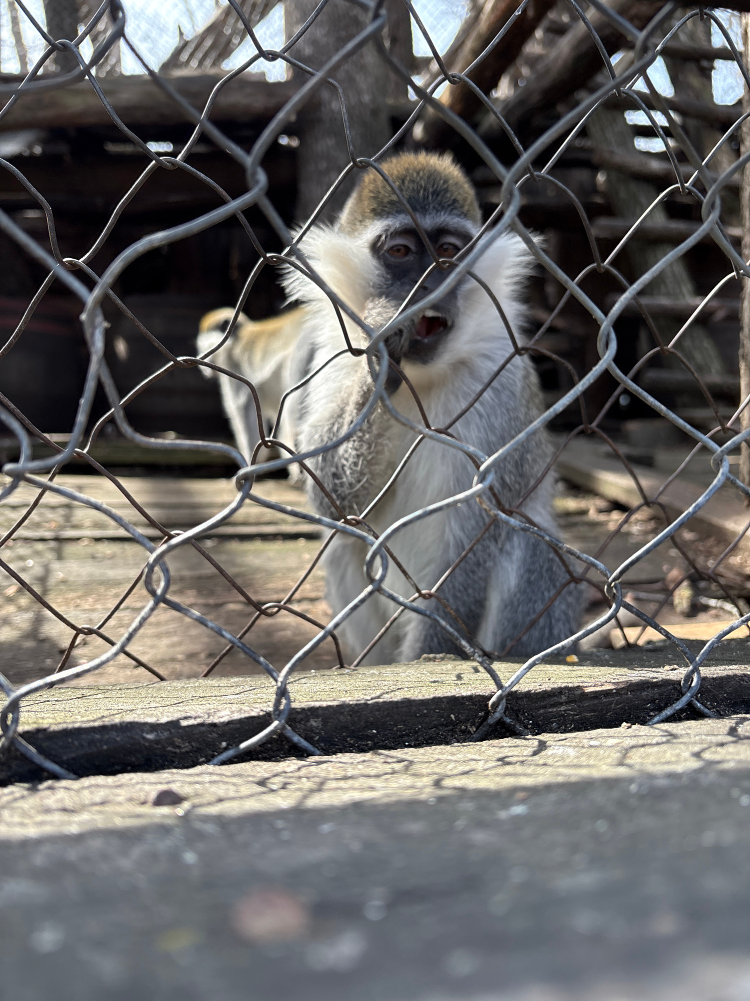 A monkey is visible behind a wire fence. The monkey has gray and white fur and is looking towards the camera. The background consists of wooden structures. The location is Goritsa, Bulgaria.