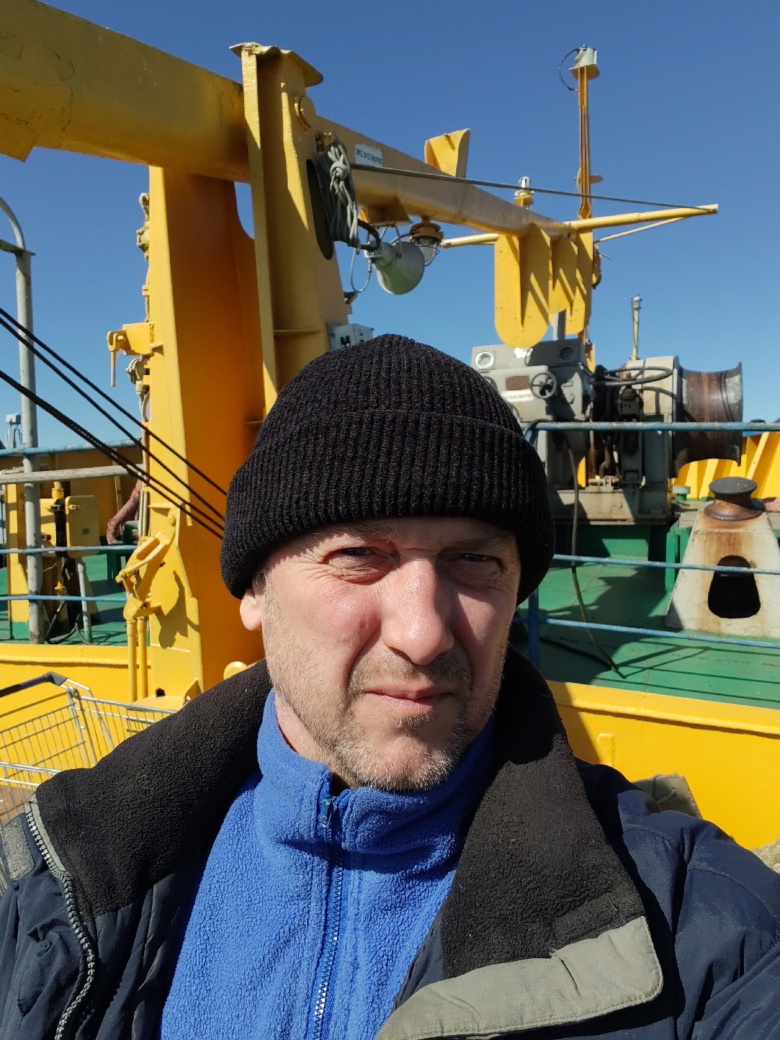 A mid-aged man is captured in a close-up selfie, positioned outdoors against a backdrop of industrial maritime equipment. He wears a black knit beanie, a bright blue zipped fleece, and a dark blue andβ¦read more