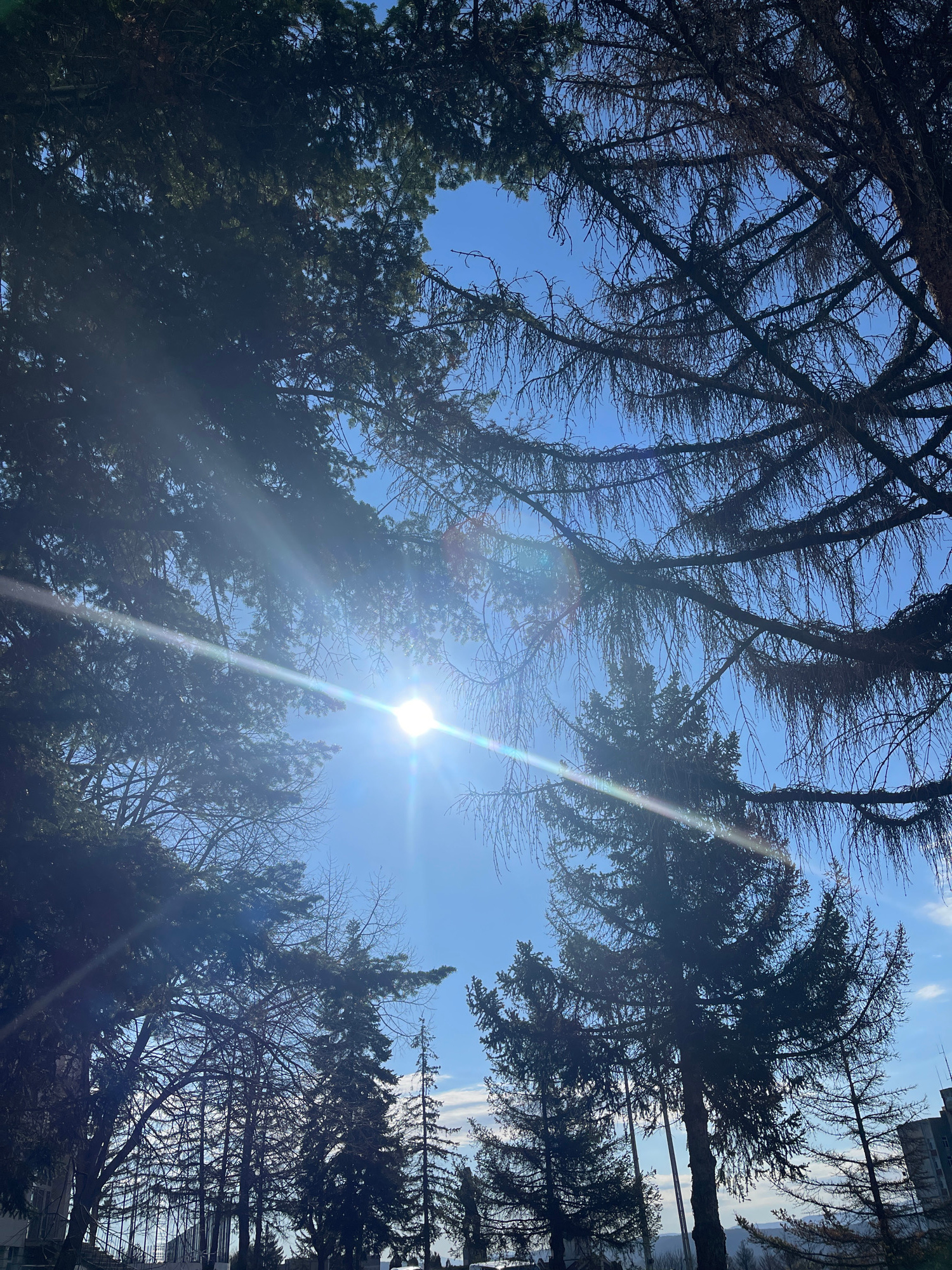 The image captures a view looking upwards through tree branches against a bright blue sky. The sun is visible in the center of the frame, creating a significant lens flare. The trees vary in type and…read more
