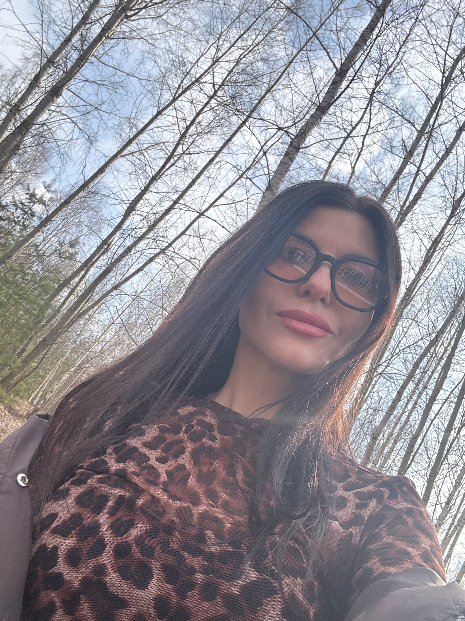 A woman with long, dark hair and glasses is the focal point of a selfie taken outdoors. She is wearing a leopard print shirt, and a grey coat is visible at the edge of the frame. The background reveal…read more