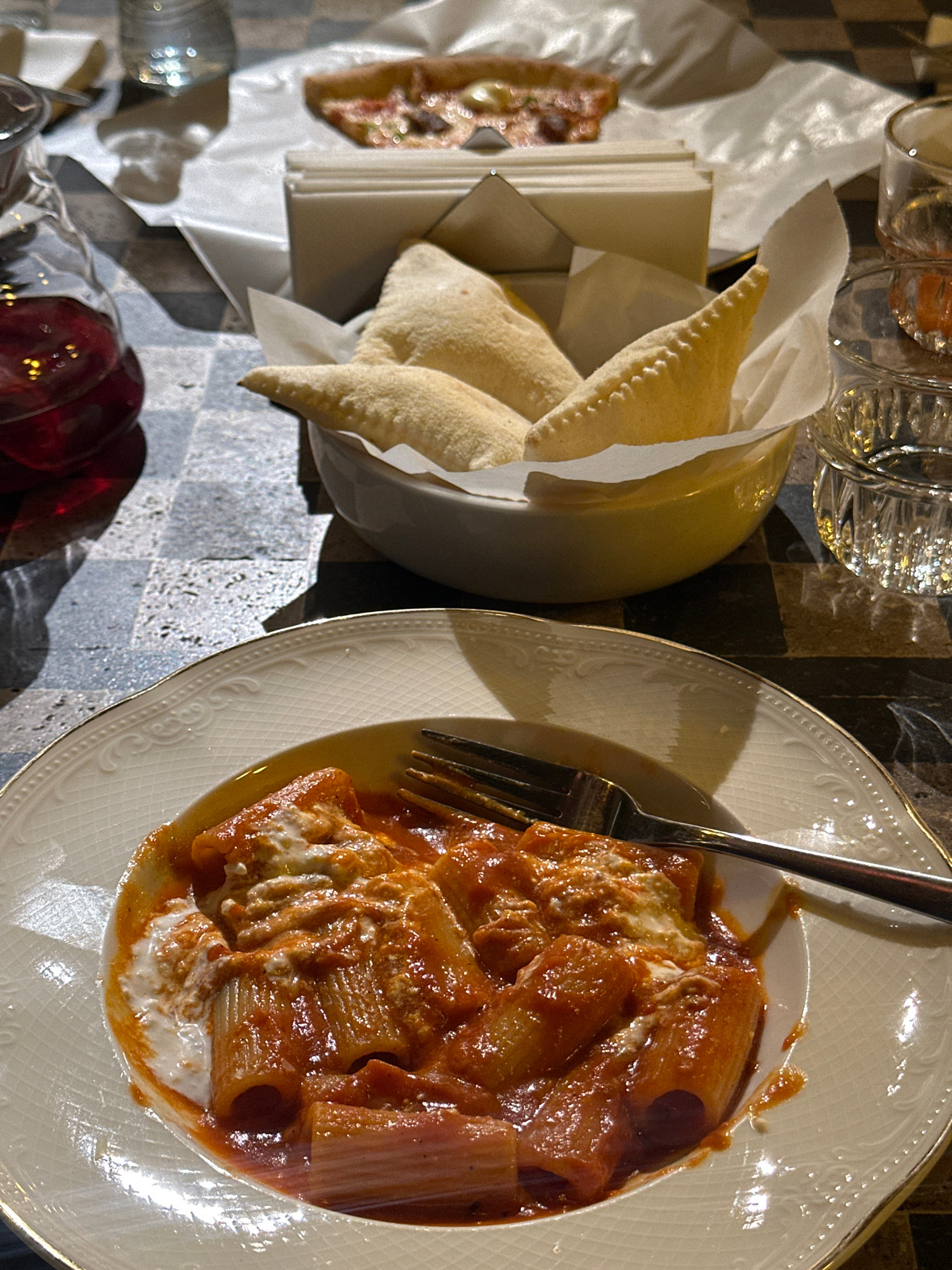 A table setting in what is likely a restaurant features a plate of pasta with red sauce and white cheese, accompanied by a fork. Nearby is a bowl containing flatbread, along with a sandwich or similar…read more