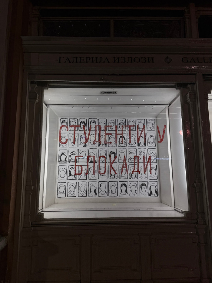 A window display features a poster composed of numerous small squares, each containing a simple line drawing of a human head. Bold red lettering is superimposed over the faces, appearing to be Cyrilli…read more
