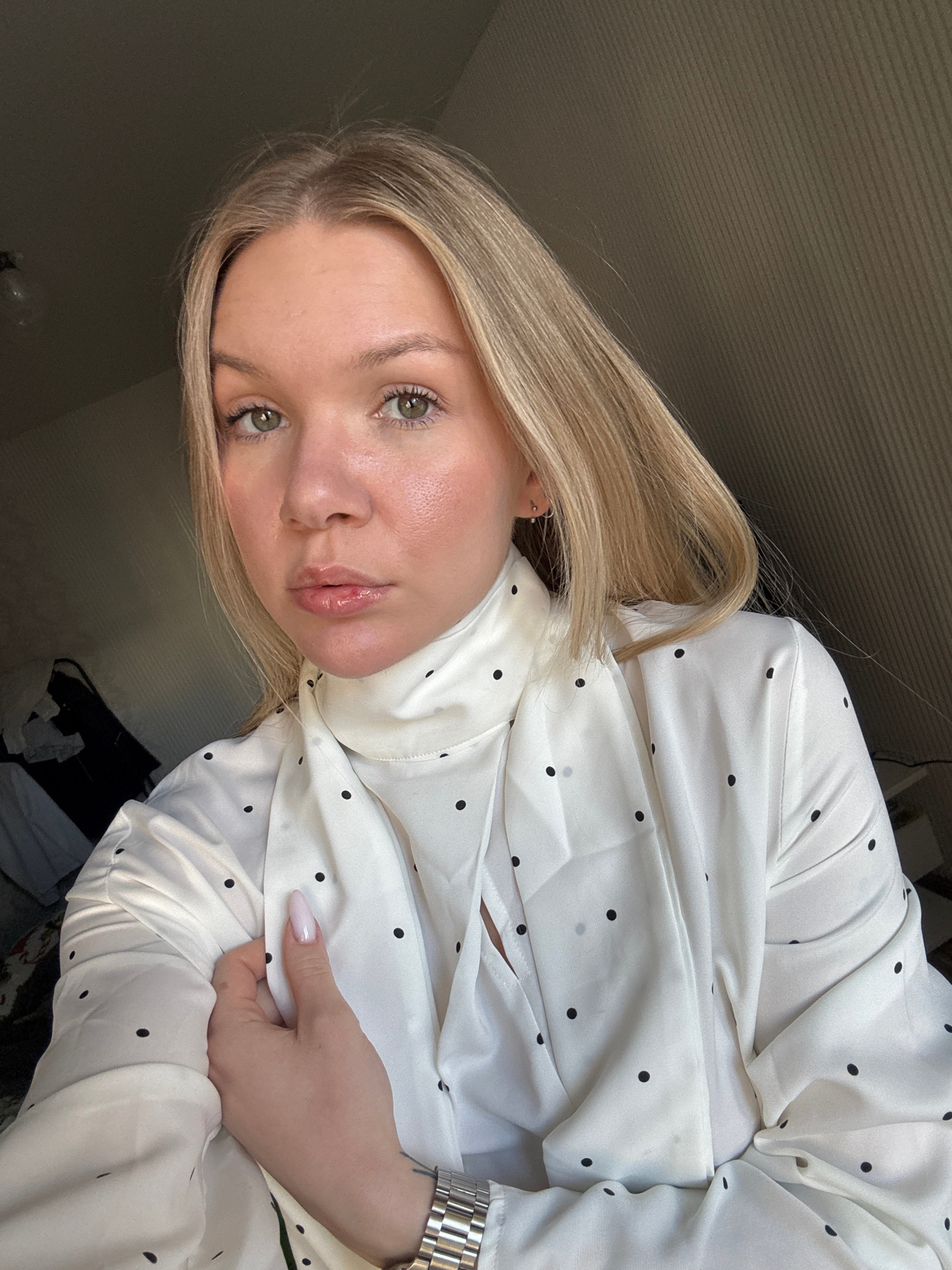 A blonde woman with fair skin is shown in a selfie-style portrait. She has green eyes and full lips. She is wearing a white blouse with black polka dots. The image is taken indoors. There is no evidenβ¦read more