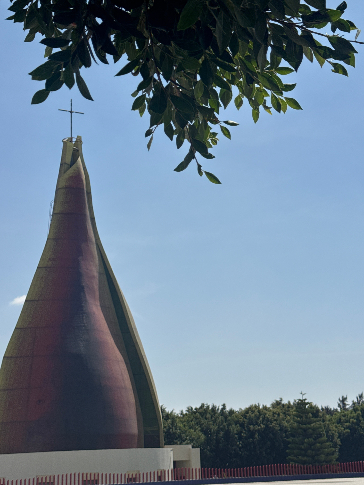 A low-angle shot of a church in San Bernardino Tlaxcalancingo, Mexico, features a copper-colored roof with a cross on top. The sky is clear and blue, with green trees and foliage on either side of the…read more