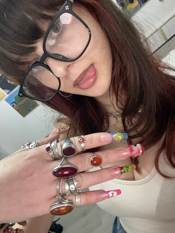A woman poses with her tongue slightly extended, wearing black-framed glasses and various rings. Her nails are long and decorated with distinct designs and embellishments. She wears a white top and a…read more