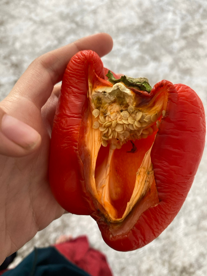A human hand, with light skin tone and visible fingernails, holds a shriveled, cut-open red bell pepper. The pepper exhibits significant wrinkling on its exterior, indicating dehydration. Its interior…read more