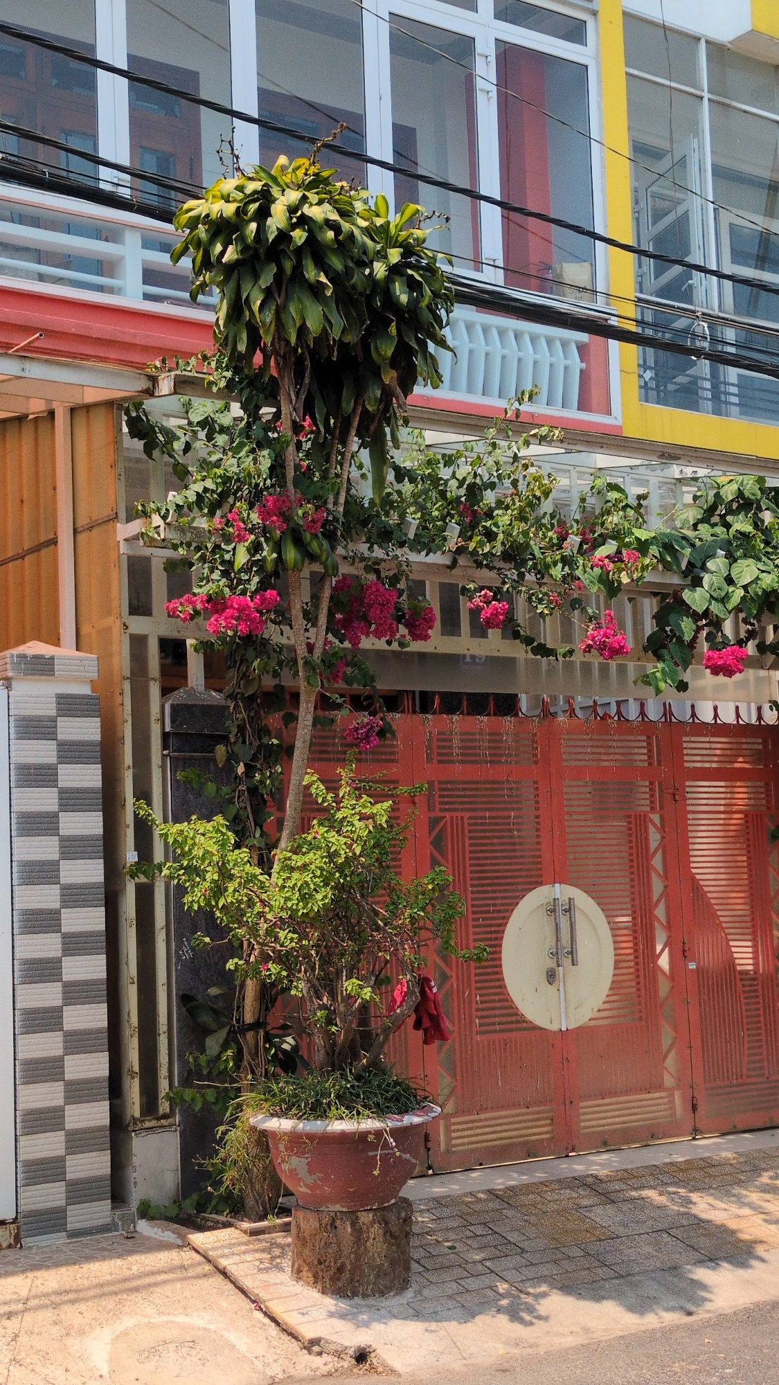 The scene is a street view in Xuân Hương - Đà Lạt, Vietnam. A multi-story building with yellow and white framing is partially visible on the left. A large clump of green leafy plants protrudes from th…read more
