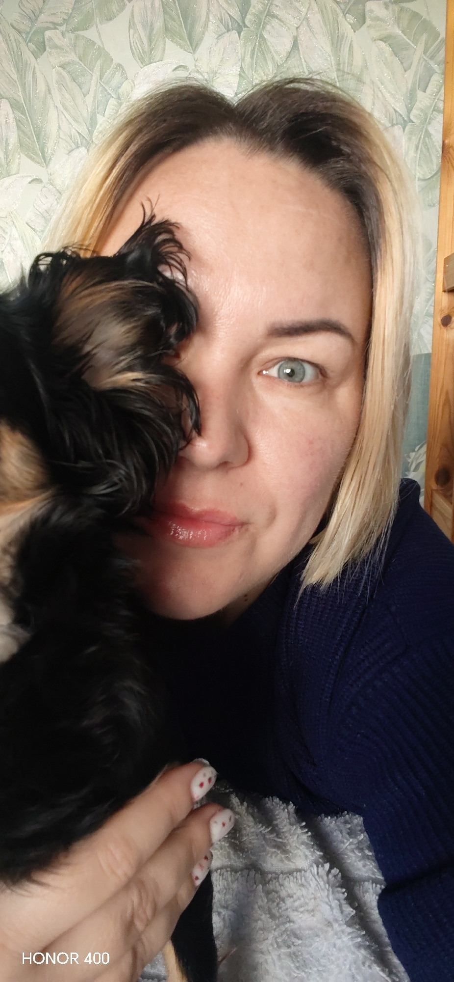A woman with short, blonde hair is holding a small, black and tan dog up to her face. The dog's fur covers part of her left eye. She has fair skin and light blue eyes. She is wearing a dark blue sweat…read more