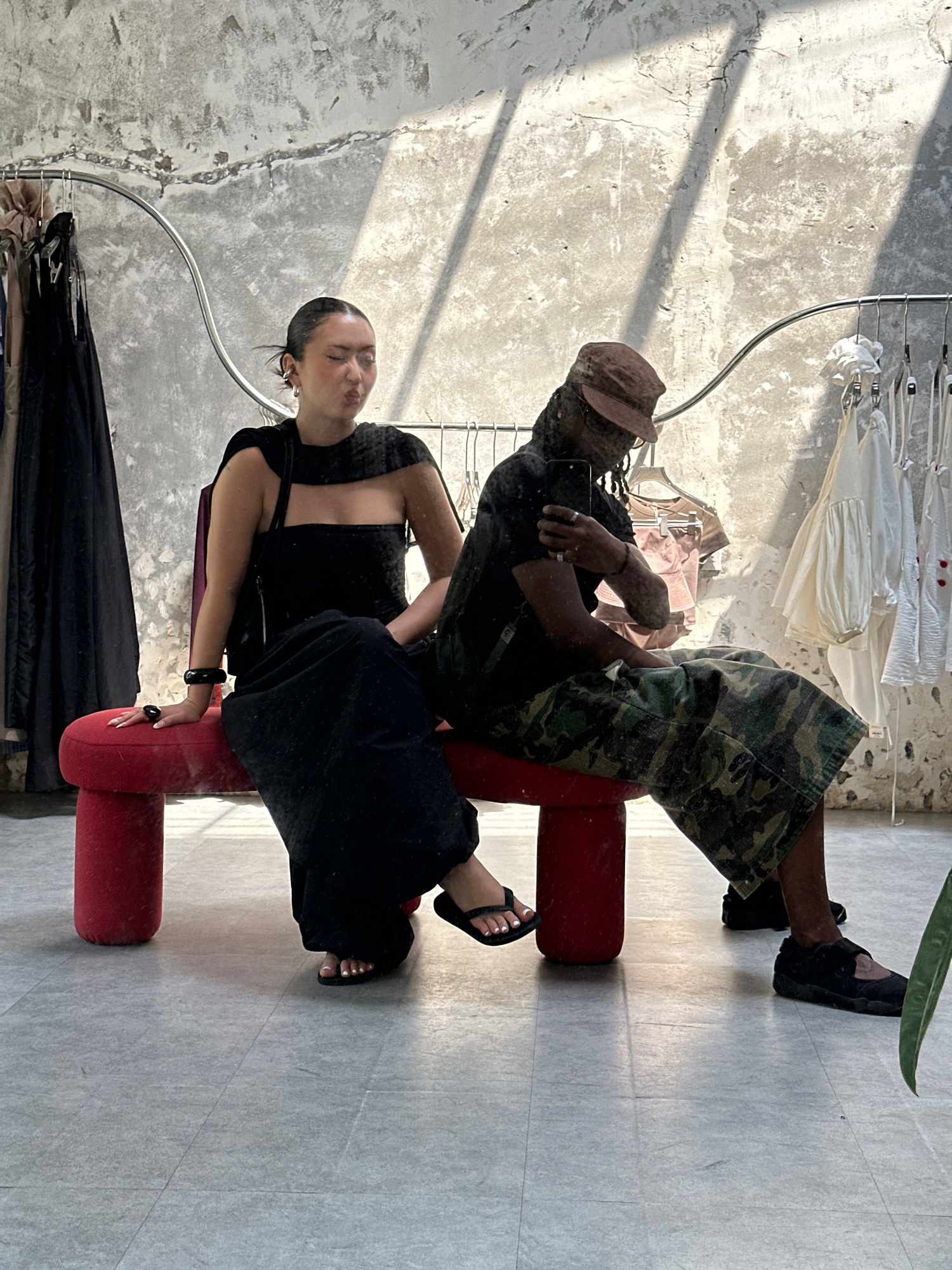 The image depicts a mirror selfie of two individuals seated on a red bench within a retail or showroom environment located in Thủ Đức, Vietnam. On the left, a female individual with dark hair pulled…read more