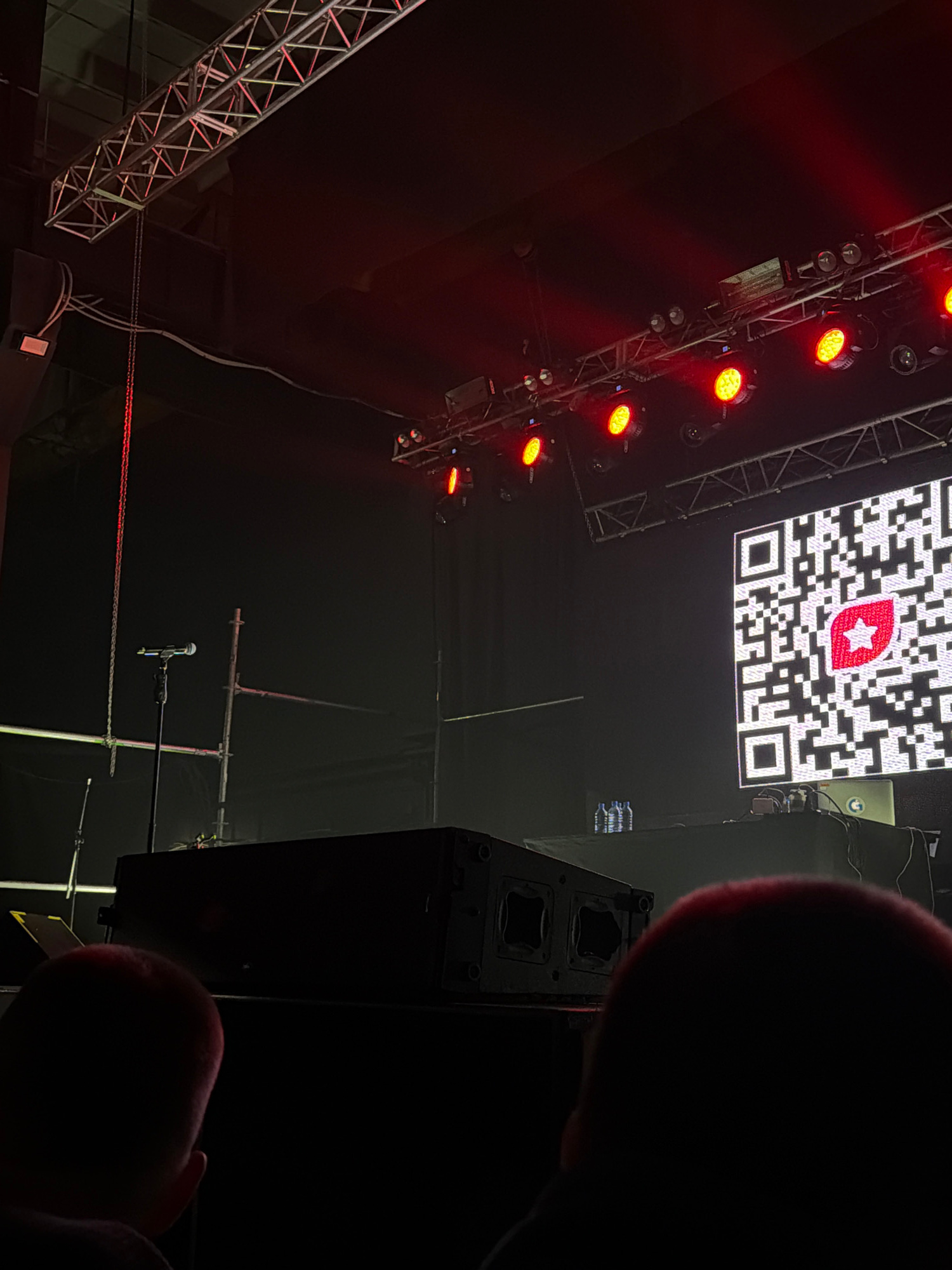 This low-light photograph captures an upward perspective within an indoor event venue or concert hall in Perm, Russia, viewed from a close, possibly audience or backstage, vantage point. The scene is…read more